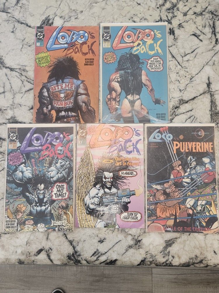 All comics are priced individually. Bulk deal for all 5 Lobo comic books $20 total. Lobo's Back #1 1991 $5 Lobo's Back #2 1992 $5 Lobo's Back #3 1992 $5 Lobo's Back #4 1992 $5 Loco vs Pulverine 1992 $5 I have other listings for sale. Willing to trade for other comic books, vinyl records, weights, vintage video games, Jordans, anything related to the Marvel Universe Venom, wrenches, ratchets, sockets