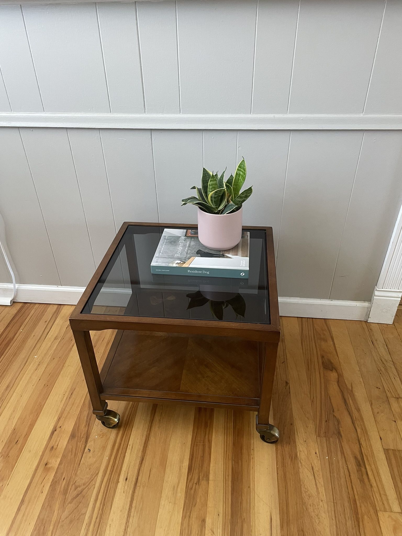 This unique Drexel Et Cetera MCM side table is a vintage dream. It is on casters and has tinted glass. There is a discoloration on the bottom wood piece (pictured). Width 19” Depth 19” Height 16.5