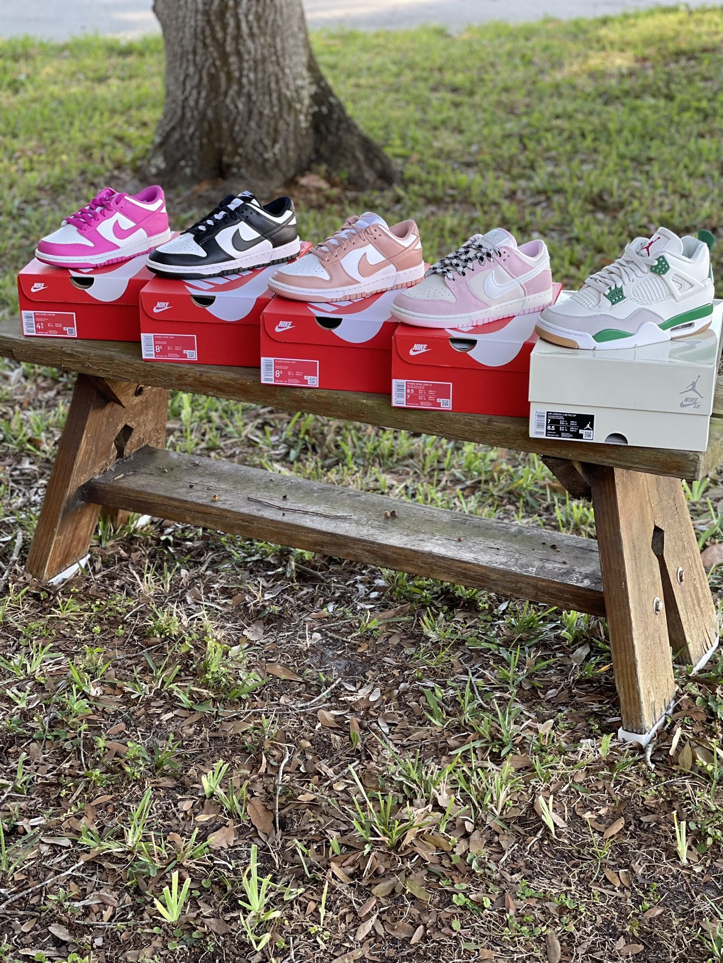 All DS Brand New Fuchsia Dunks 4.5y- $110=SOLD Panda Dunks 8.5 w- $140=SOLD Rose Whisper Dunks 8.5w- $140=SOLD! Pink Foam Dunks 8.5w- $140=SOLD Jordan 4 Retro SB 7m- $350=SOLD