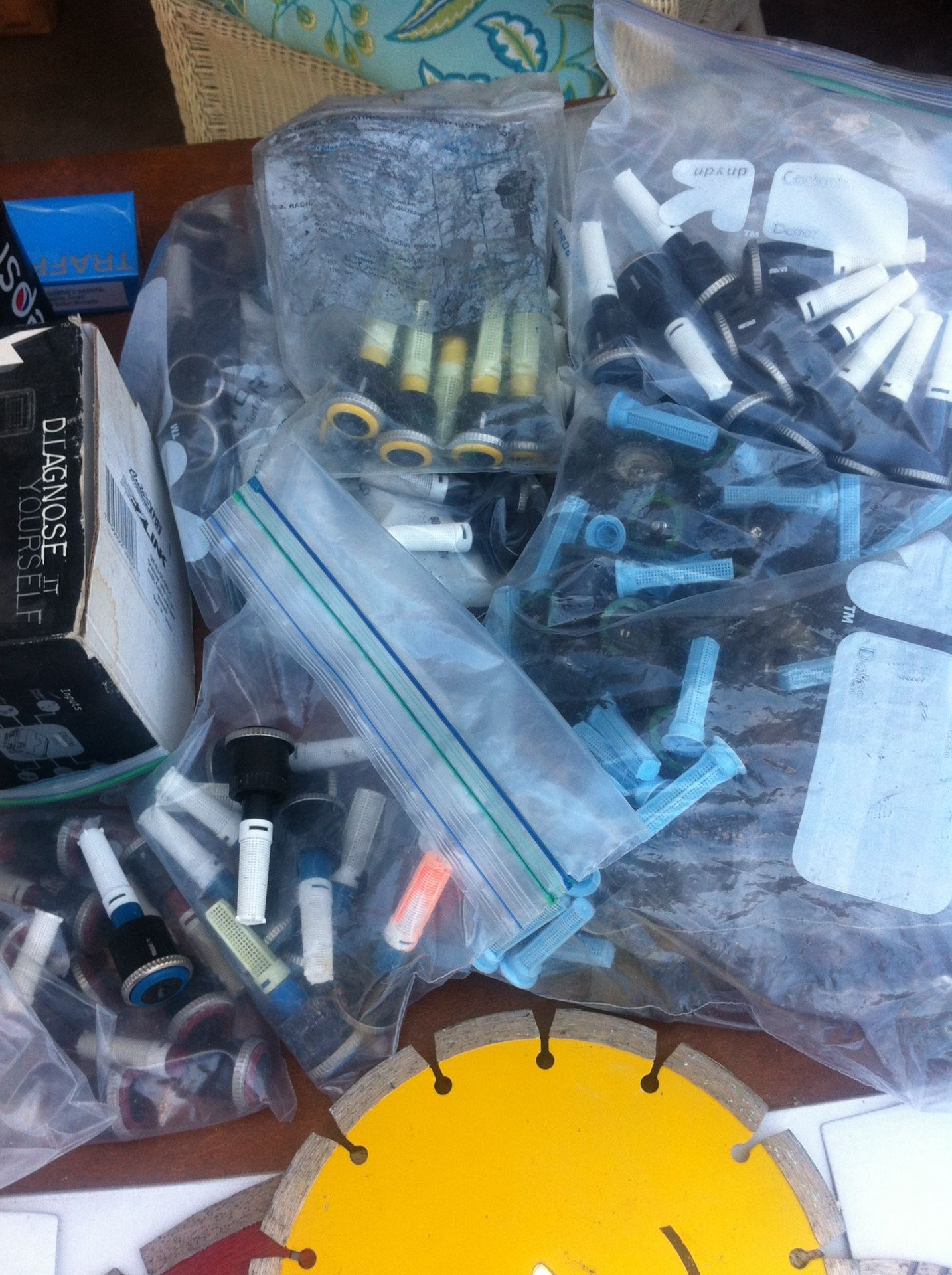 Have a lot of Rotory sprinkler nozzles. Both Hunter and Rainbird. $4.00 each Also have a ton of regular Hunter /Rain bird / Toro nozzles. All degrees of spray $1.00 each Also have a lot of 6” $ 12 Hunter sprinkler Heads. Also a lot of Sch40 Fittings. I’m Also numerous other irrigation items. MUST BYE A MINIMUM OF $30.00 I also have all kinds of other irrigation products. From heads, 12 inch and 6 inch hunters. Wire/copper fittings/schedule for fittings/numerous Hunter and Rainbird spray nozzles with screens. Some drip stuff. Some valves ABS fittings/wire connectors for lighting and irrigation connectionswaterproof. And miscellaneous other things. We’ll get rid of them at a reasonable price.
