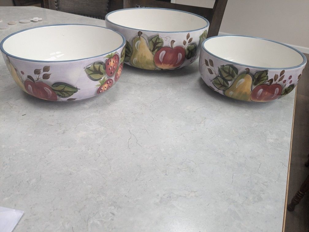 New set of 3 serving bowls 10, 9,8 inches .never used on for decoration . Would make a cute table setting . No chips or flaws