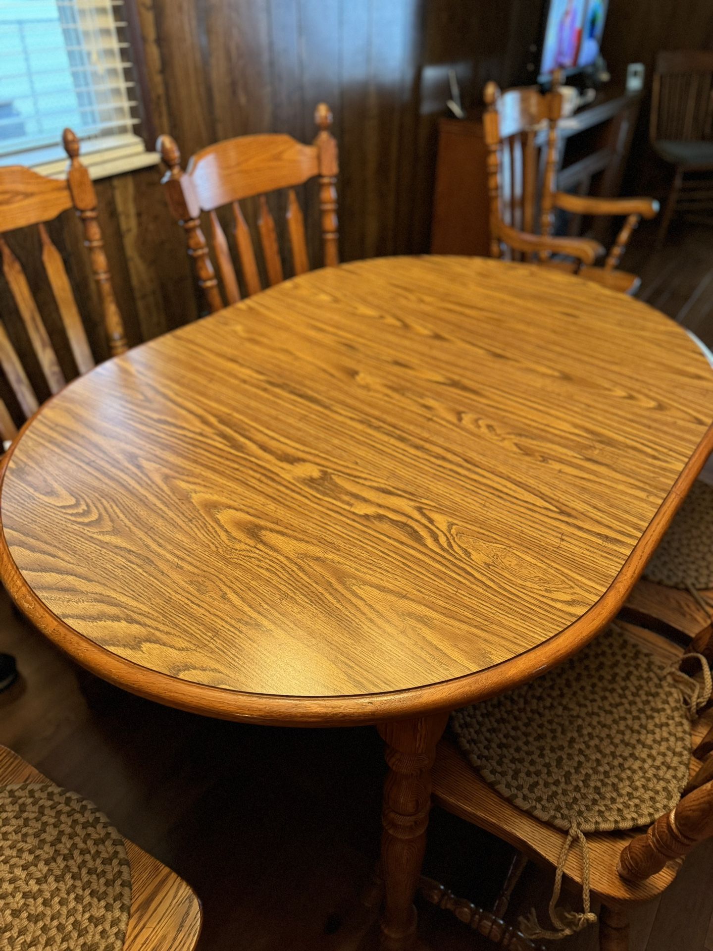 St. John’s Dining room set. Oval table measures 60“ x 42“ +2-12 inch leafs for a total of 84 inches. 5 armless chairs + 1 with arms. Matching china cabinet 56” wide x 74” high x 19” deep.