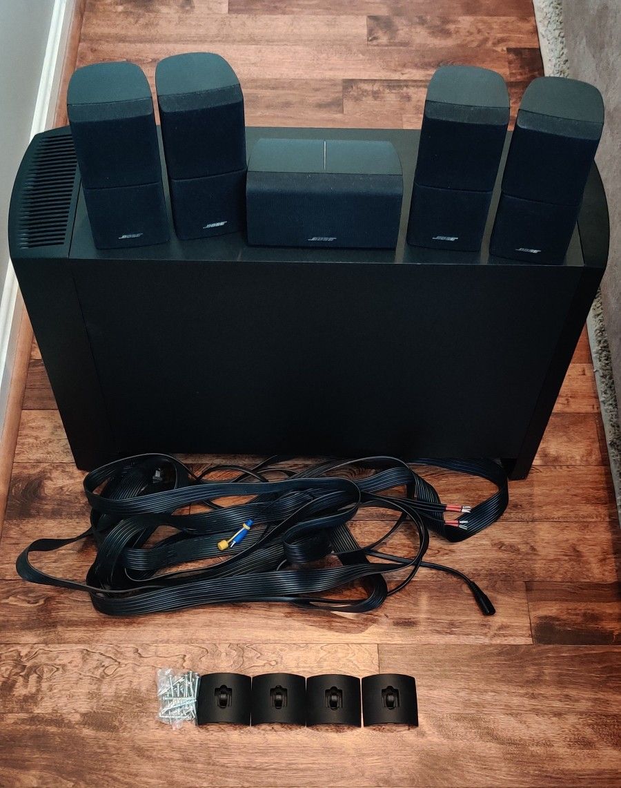 LIKE NEW! Bought for $1000. The speakers were rarely used and are in great condition. The four speakers brackets and screws make it easy to install on your walls if you wish. Included: Subwoofer Center speaker Four cubicle speakers (front and rear) Four speaker brackets with screws Cabling for the speakers Takes up less space and provides excellent sound and theater experience. Recommended power 10-200 watts with receivers rated from 4 to 8 ohms