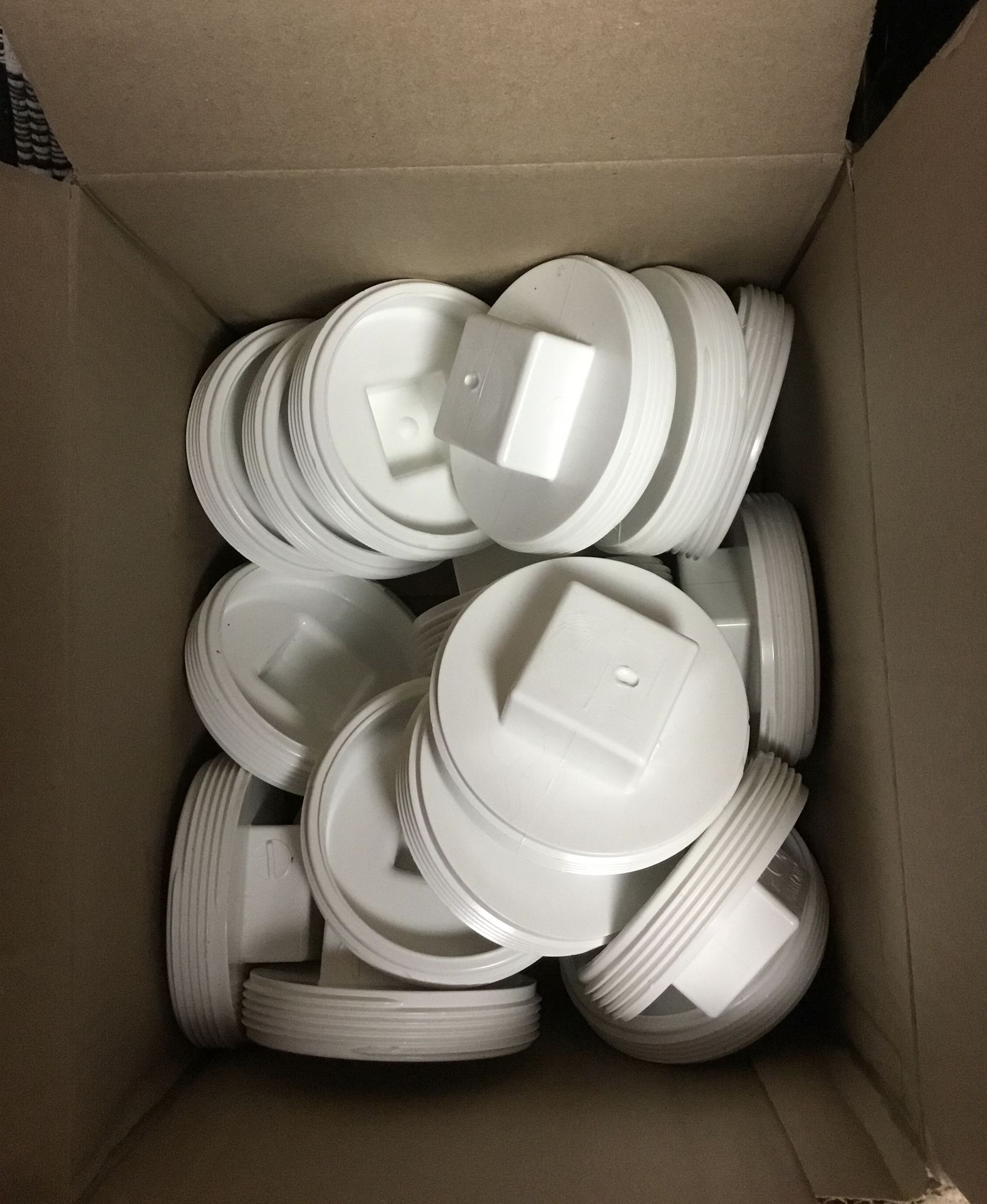 New PVC 4 inch cleanout plugs. There are 20 of them in the box. Great for plumbing projects.