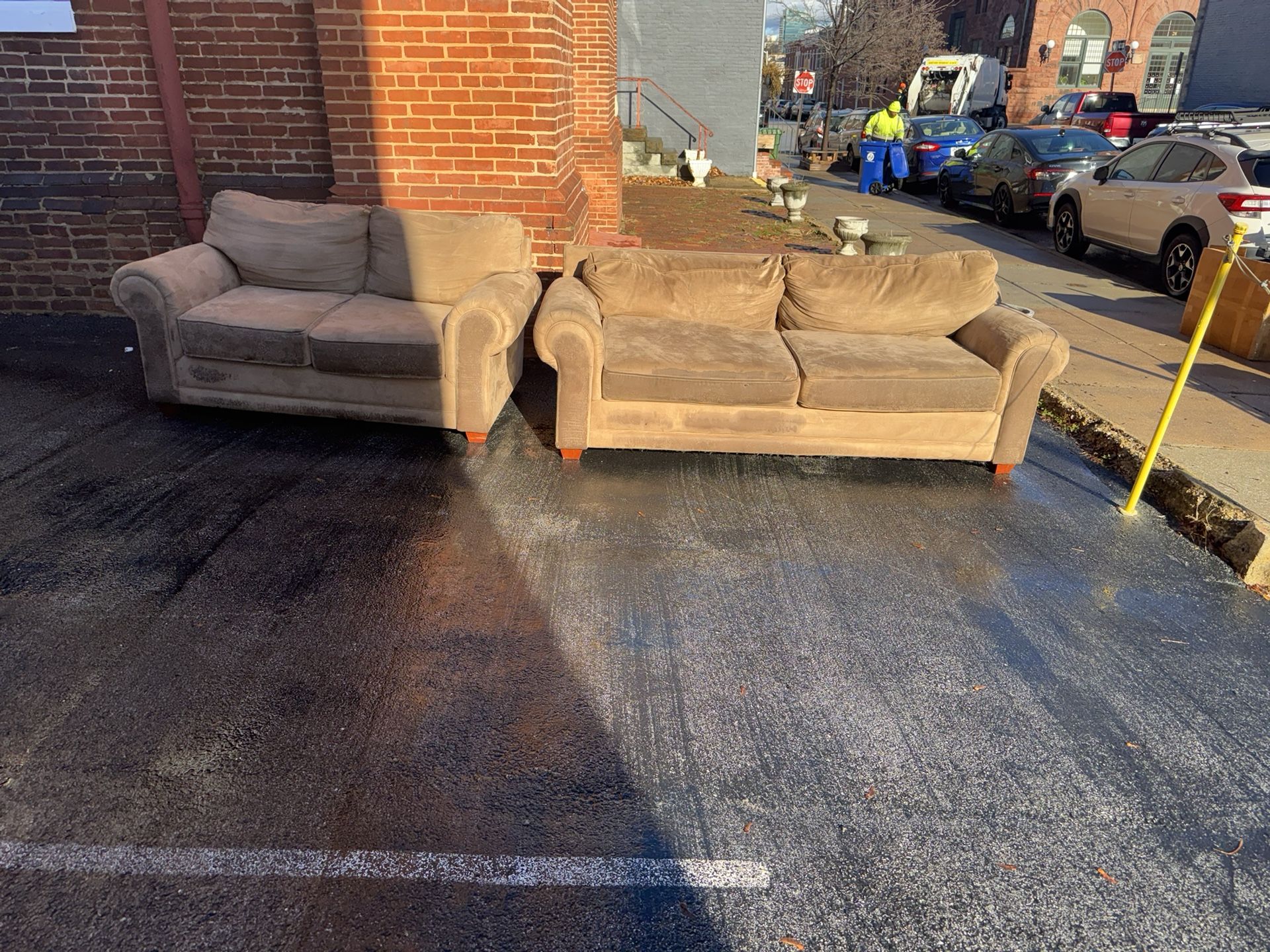 Free couches, first come first serve, church parking lot next to 1312 Patapsco St, Baltimore MD 21230