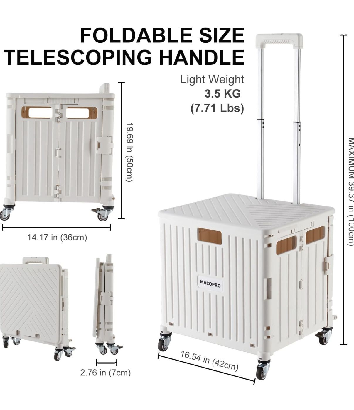 Foldable Utility Cart Folding Portable Rolling Crate Handcart with Durable Heavy Duty Plastic Telescoping Handle Collapsible 4 Rotate Wheels for Travel,Shopping, Luggage, Office, Teacher(White)