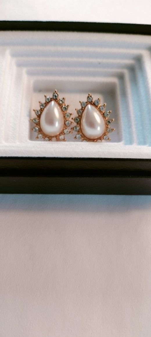 Beautiful Monet Gold Tone Simulated Pearl Teardrop White Rhinestone Post Earrings.
