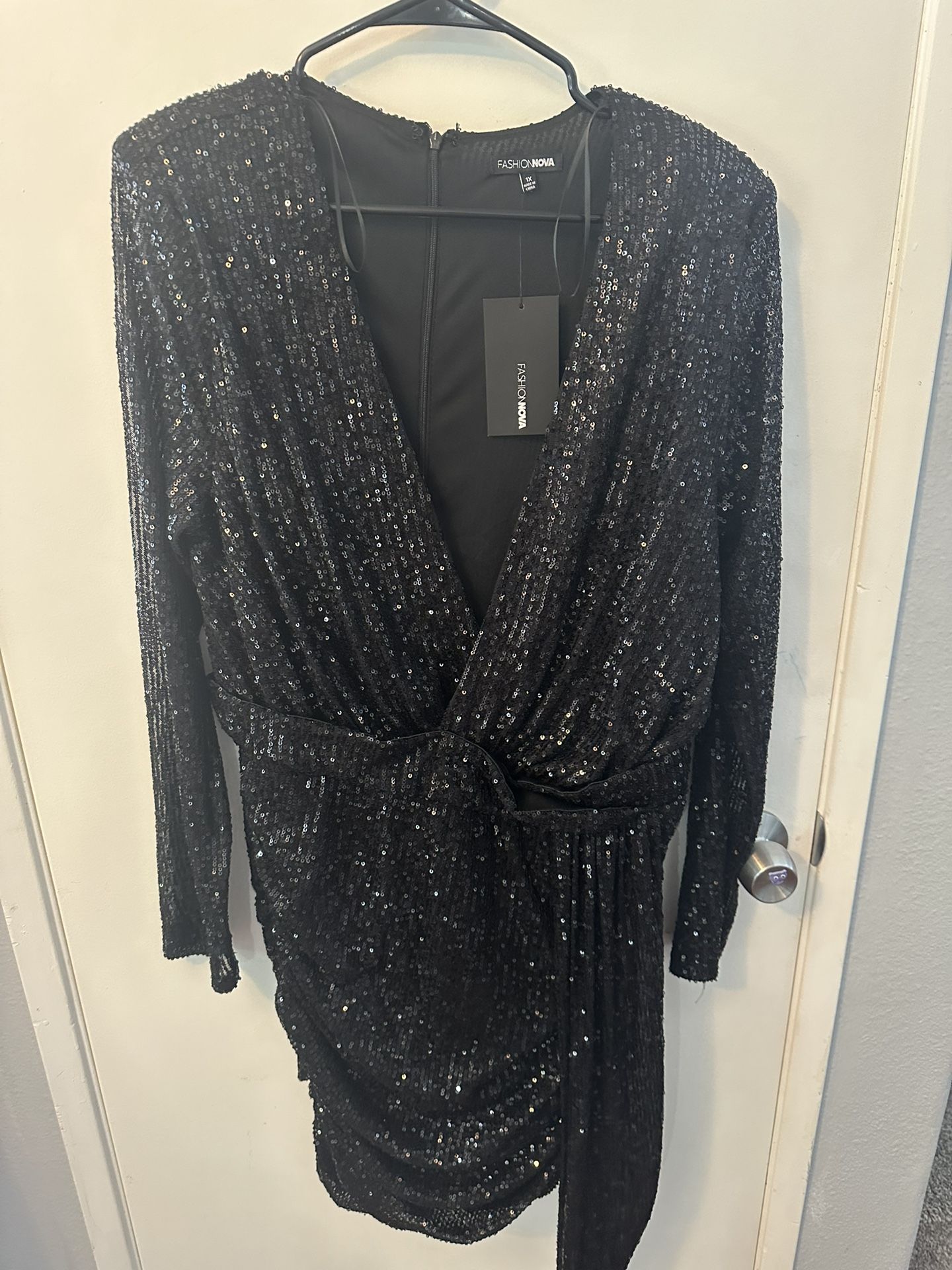 Brand New with tag Fashion Nova Sequin dress size 1x (black) Fashion Nova Sequin shorts one piece size 1x (black) Price is $50 for both or make an offer