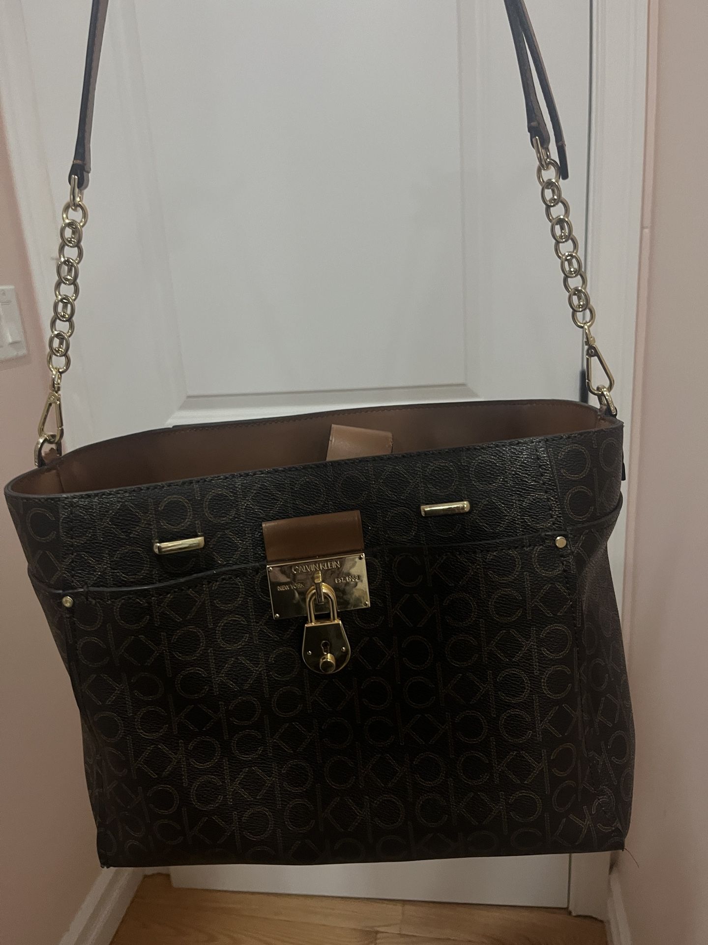 Selling a Calvin Klein tote bag with the CK logo pattern in brown. It has a chain-link strap and a lock detail. There is some green staining on the inside lining.