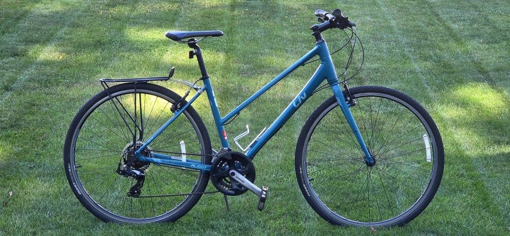 GIANT LIV ALIGHT FITNESS HYBRID EDITION - Beautiful Teal Blue In Color , women's Series , Twenty One Speed , Eighteen And A Half Inch Crank To Top Tube ( 45.72cm ) . Top Tube is Twenty Three Inches , Rigid Fork , Easy Release Seat Post , Quick Release Front And Rear Wheels , Tourney TX Components , Manufacturers Double Wall 700c Wheels , Giant Manufacturers 700@35 Tires , New Pedals , New Cables , New Bottle Cage , Comes With Rack And KickStand . Tuned . Ready To Go . Makes A Great Gift . Please Call With Interest . My Name Is MIKE Price Is Firm $399.00 (440)994-014Five