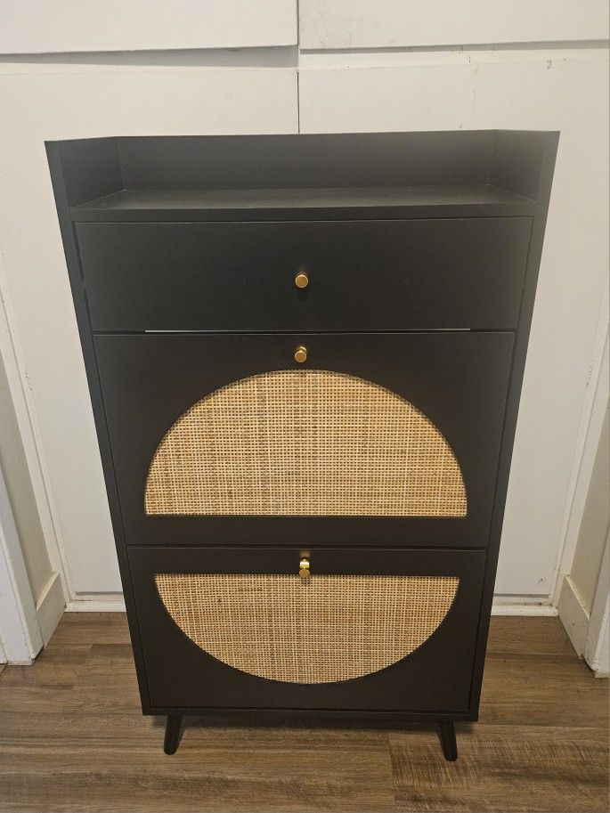 W24" x D9.5" x H43.5" Fashionable and attractive shoe storage unit. Can hold up to 10 pairs of shoes. Has a drawer to keep everyday things. Top shelf for decorative items or more storage
