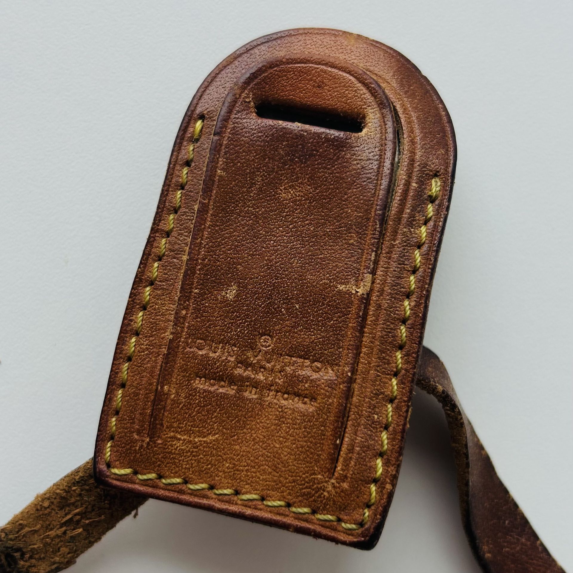 Authentic Louis Vuitton Paris luggage tag in unfinished (vachetta) leather, dating to circa 2005. This is a smaller, unique-sized tag, originally attached to a Louis Vuitton bucket-style bag. Its compact size makes it a rare and collectible accessory, versatile for other Louis Vuitton handbags or small travel luggage pieces. This tag has been personally owned and cared for — I am not a reseller, and every item in my closet reflects personal ownership. It bears the desirable patina. Details: • Classic Louis Vuitton unfinished (vachetta) leather with beautiful natural patina • Strap shows normal wear; leather is thin in spots where it attaches to the tag (can be replaced or professionally restored) • Brass rivet shows oxidation • Gold-tone buckle shows wear and partial loss of finish • Tag itself is in very good vintage condition • Tag dimensions: 2.75” L x 1.5” W • Strap length: 8.5” • Original, unrestored condition Condition Notes: • Tag: very good vintage condition with desirable patina • Strap and hardware show wear and aging but are restorable by a collector • Sold as-is; perfect for someone looking to restore, recondition, or customize. Potentially attach tag to another strap to have a great LV collector item. A timeless, collectible Louis Vuitton accessory, ideal for collectors, restoration enthusiasts, or anyone looking to add a unique travel tag to their Louis Vuitton set.