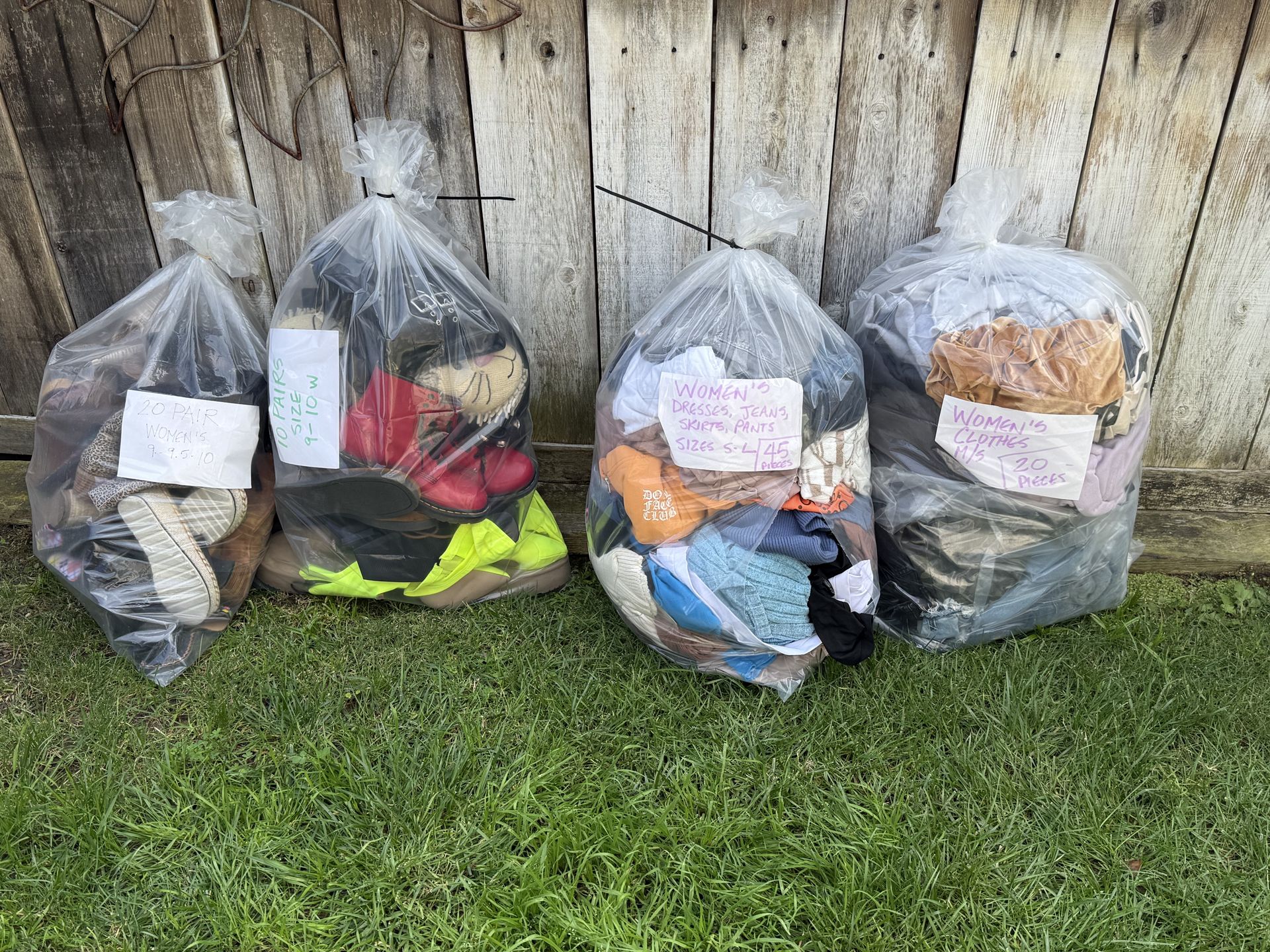 Giant bags filled with gently used women’s shoes and clothes ready for selling. You can see how many pair of shoes and how many pieces of clothing are in each bag. Asking $50 a bag. $200 for all. You’ll make three times that at least. I’m just not doing the swap meet thing anymore or I’d sell it all.