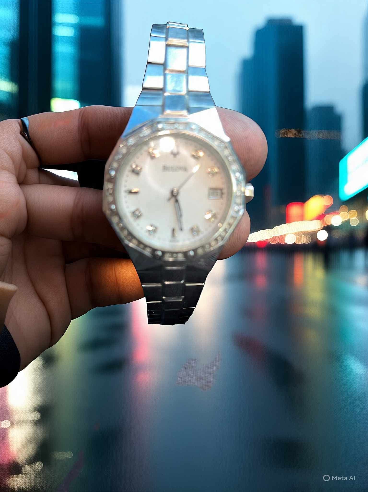 Silver watch with a bracelet band. Diamonds around the watch face and for the numbers