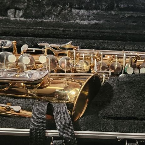 TAKING OFFERS Gold Brass Alto Saxophone Eb Lacquered Finish with Case. ( I'll send you a video of it if interested ) . In good condition ( needs cleaning ) . Durable . Easy to Maintain . Good for beginner/intermediate horns