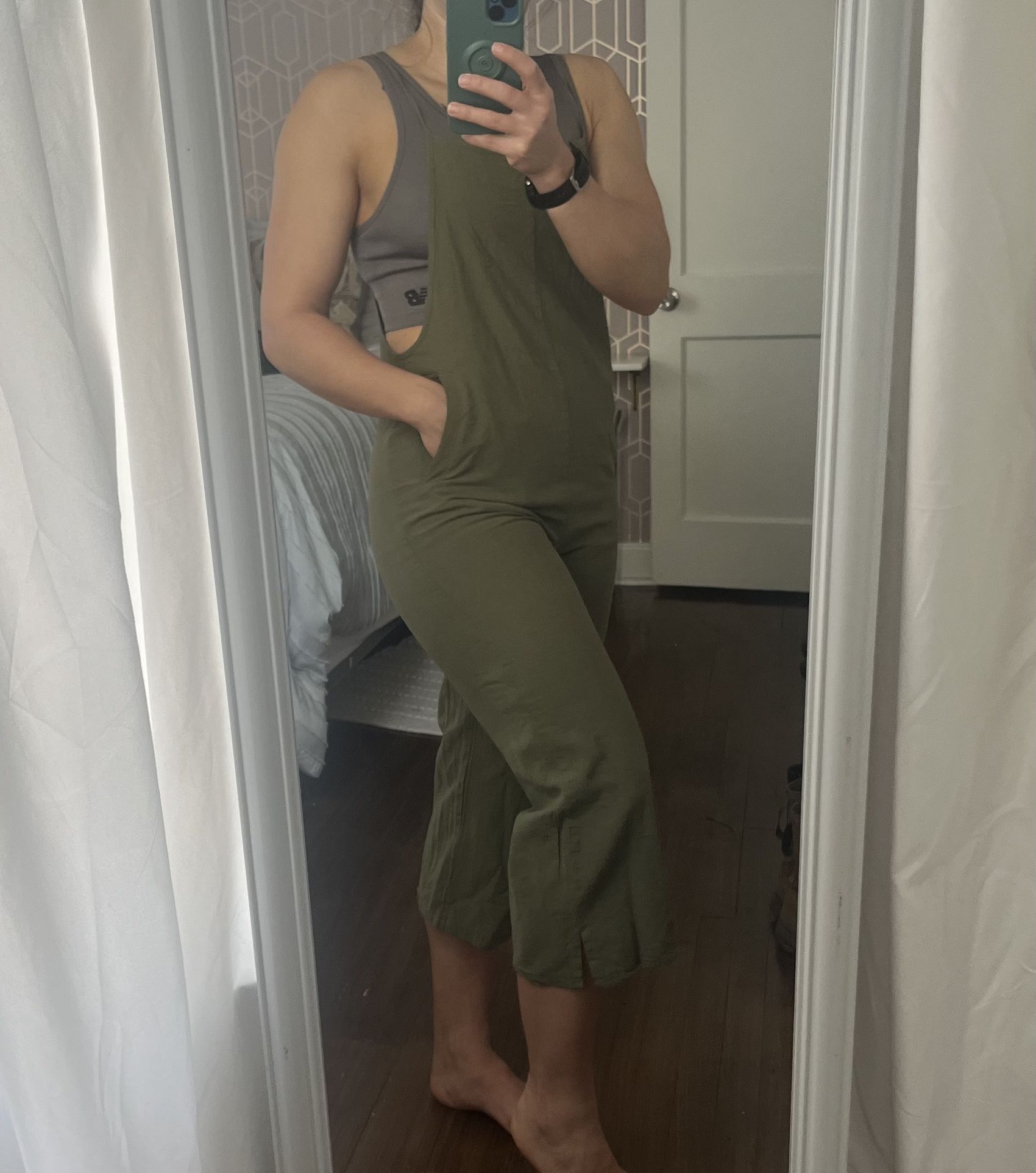 Size S, very pretty olive green color, 2 functional pockets in the front and adjustable shoulder straps. Length is ~mid calf. Comfortable 100% cotton material. For reference I’m 5’2” and 140 lbs so it’s a little snug on my thighs, but has stretch.
