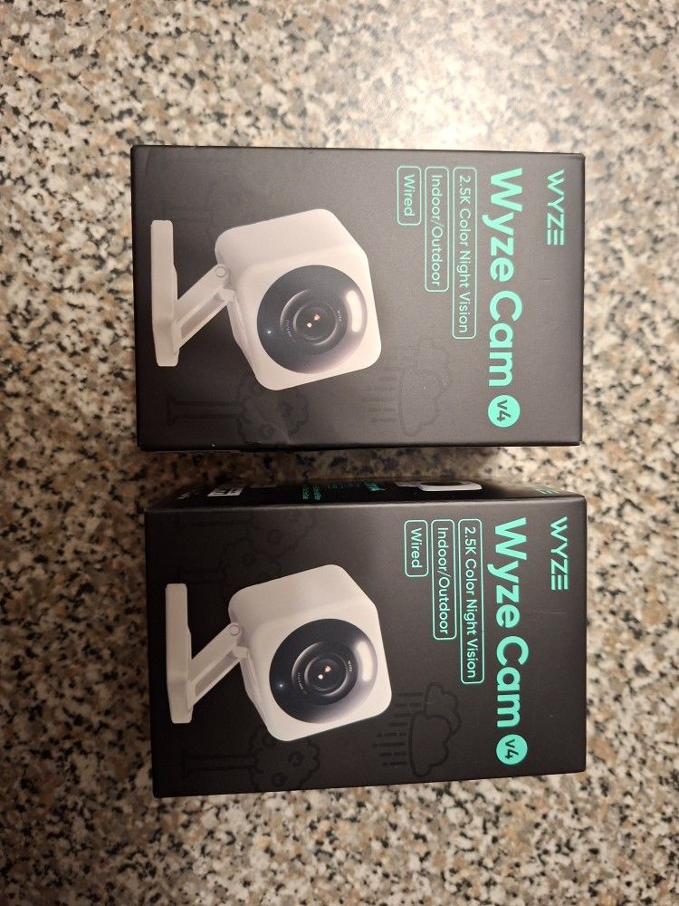 Set of 2 - Brand New, Unopened Wyze Cams V4. $45 Cash Only for Both. Will NOT Separate. Must Pickup in Shoreline. Wyze Cam v4 Specs: Colors & Materials Colors: White and Grey Body: Polycarbonate Lens: Glass + Plastic Lens FOV: DFOV 115.8°, HFOV 98.5°, VFOV 53.1° Sensor: CMOS Starlight Sensor LED Indicator: Front. Red + Blue. Dimensions & Weight 2in x 2in x 2 3/8in 0.49 lb (222 g) Mounting Stand, wall mount, ceiling mount, or magnetic wall mount (adhesive) Power Power Adapter: Input 110-240 V (AC/DC), Output Indoor 5V/1A Outdoor Power Adapter (sold separately) Cable: 6-Foot Flat micro USB to USB-A Video Resolution: 2.5K QHD (2560x1440) Digital Zoom: 8x Wide Dynamic Range (WDR): Yes IR Lights: 4x850 nm Day/Night Vision: Yes Night Vision: 4 IR LEDs (850 nm) + 2 white spotlight LEDs (72 lumens) Color Night Vision: Yes Video Encoding: H.264 Video FPS: Daytime 20 FPS / Nighttime 15 FPS Audio Speaker: 99dB, waterproof Simultaneous 2-way Talk: Yes Built-in Siren: Yes Noise & Echo Cancellation: Yes Connectivity & Compatibility Bluetooth® 5.2 Wi-Fi: 2.4 GHz Wi-Fi, Wi-Fi 6 Phone Compatibility: Android 9.0+, iOS 15.0+ Integrations: Alexa, Google Assistant, IFTTT Storage Local (microSD card required) MicroSD card up to 256GB Cloud (with subscription plan) Weather & Temperature IP65 weather resistant Operating temp: -4ºF - 122ºF (-20ºC - 50ºC) Storage temp: -40°F - 158°F (-40°C - 70°C) Warranty 1-Year