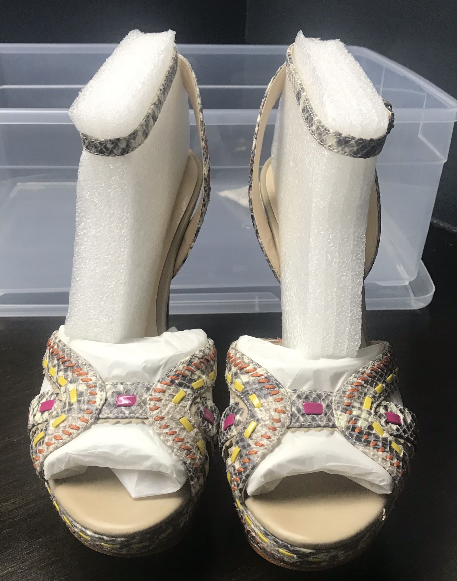 Authentic. Brand new. Snake print. 4.5 inch heel. Does not come in original box. Will ship in plastic bin from the Container Store