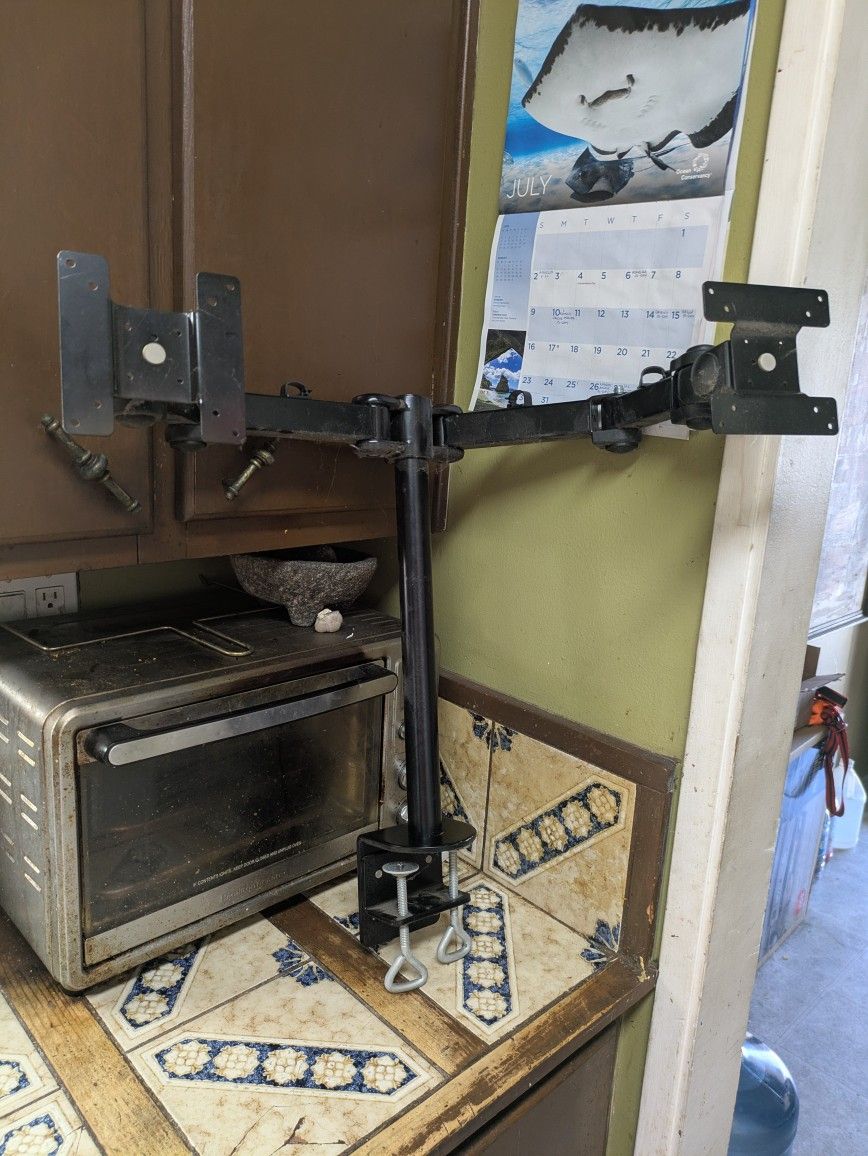 Black metal desk monitor mount. Holds 2 monitors. Never used, no longer need. Was for security monitors but changed system. I don't see screws to mount monitor so you'll have to purchase. ?