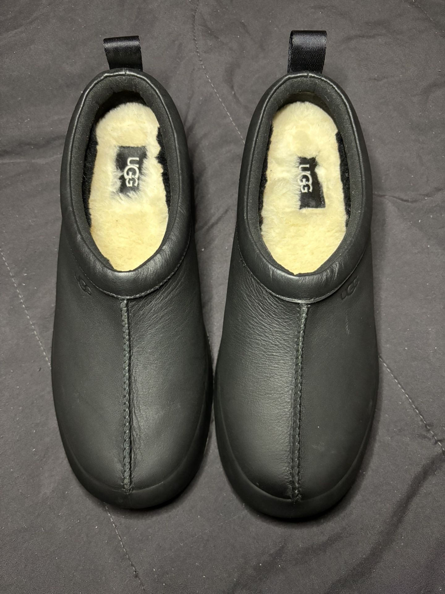 Black leather UGG low-top plush boots. Women’s Size 8. Brand new, never worn. 100% authentic or your money back guaranteed.