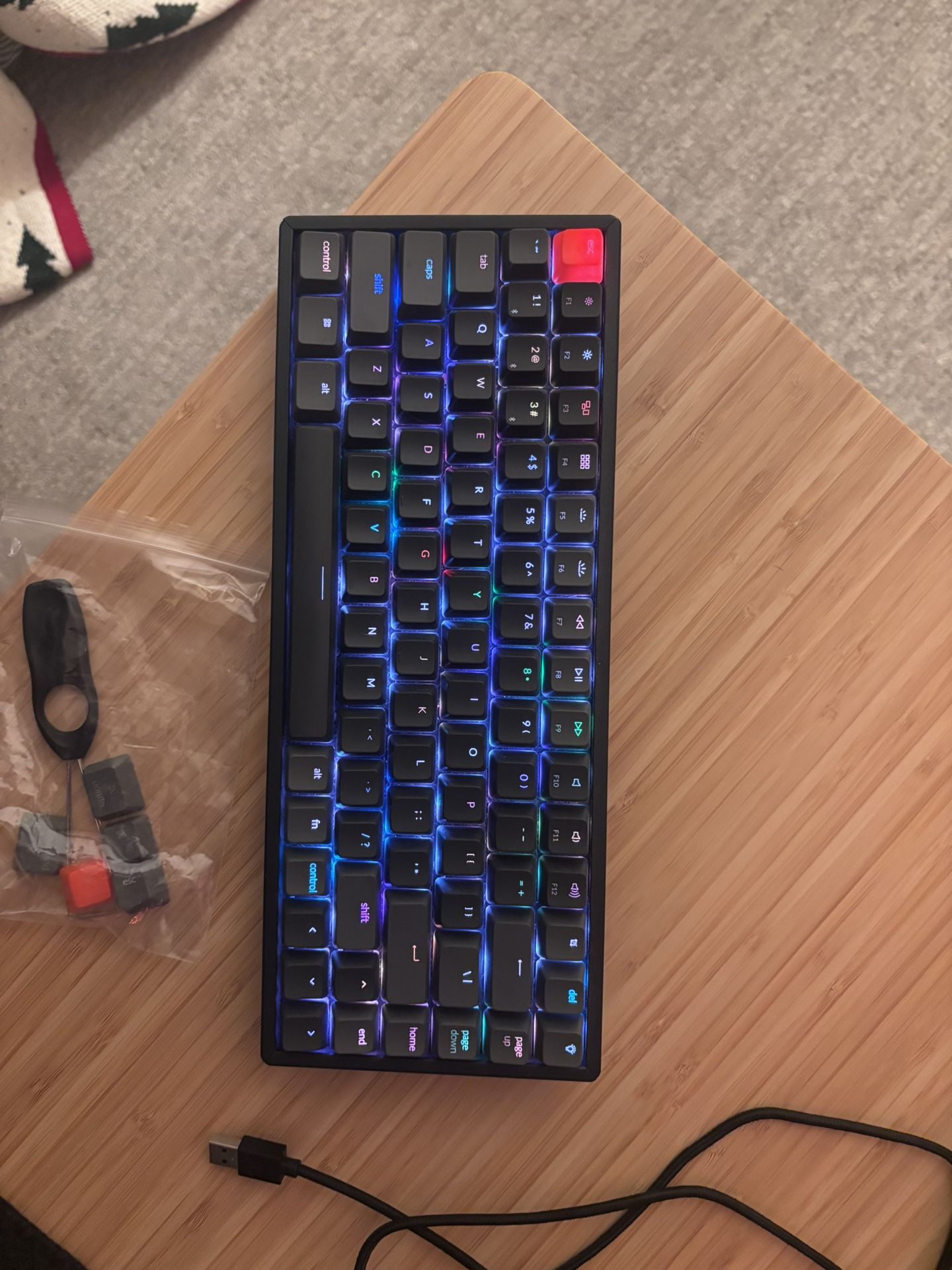 Used Keychron K2 Wireless. RGB. It can connect to computer via USB cable or Bluetooth. Comes with box, charging cable and all extra keys. Still works well. Upgraded to bigger board