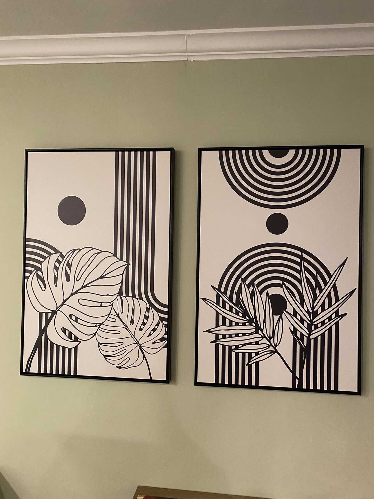 2 large black and white canvas print wall hangings. These have a modern flair and are set in a black frame! Both come new in packaging and includes hardware for hanging.. Dimensions: 24” x 36” x 3”