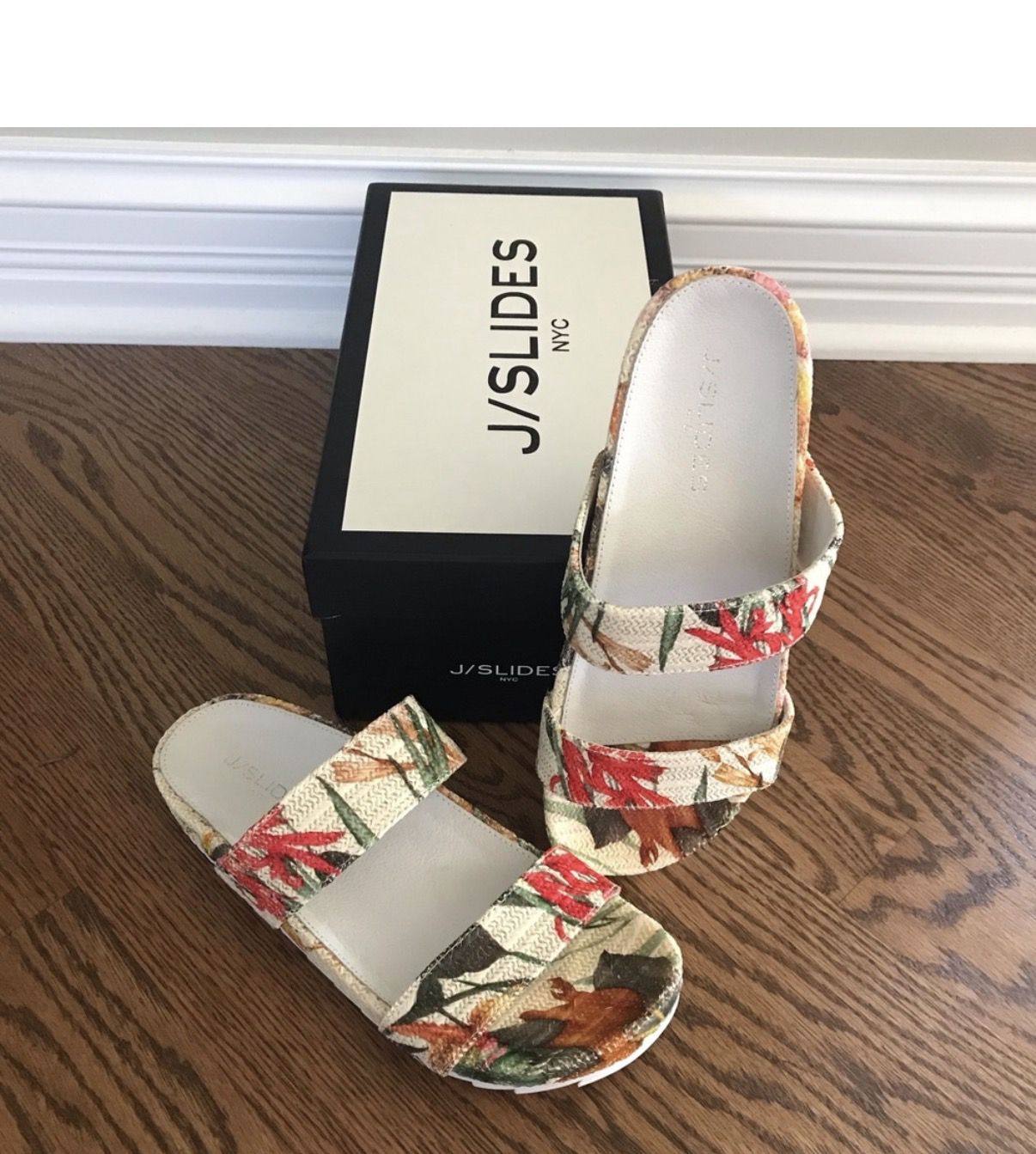 Brand new in the box. J / Slides brand Edie style Size 7 women’s Super cute tropical floral pattern. Dress them up or down. The perfect sandals to complete an outfit. Please note that the box shows some wear. Were $168 new. Online description: “From fun summer beach parties to backyard barbecues with friends and family, these J/Slides Edie women's sandals make a splash and keep you comfortable anytime you want to incorporate lightweight, breezy footwear into your look. The rubber material provides just enough support to protect your feet while the comfy open-toe of the shoes lets the fresh air bathe your toes. Whether you are donning a t-shirt and shorts for a casual outing or getting dolled up in a frilly sundress, all it takes is a little imagination and accessorizing to tie it all together with J/Slides sandals.“ Smoke / pet free home. I have other shoes posted and also men’s, women’s and kids clothes and shoes. Pick up near the Burr Ridge Mall (I-55 and County Line Road) or WILL SHIP. I am happy to bundle shipping if you want multiple listings. Fast shipping! Tags: Nordstrom Evereve Anthropologie Vince Lilly Pulitzer Birkenstock Vineyard Vines Michael Kors Ralph Lauren