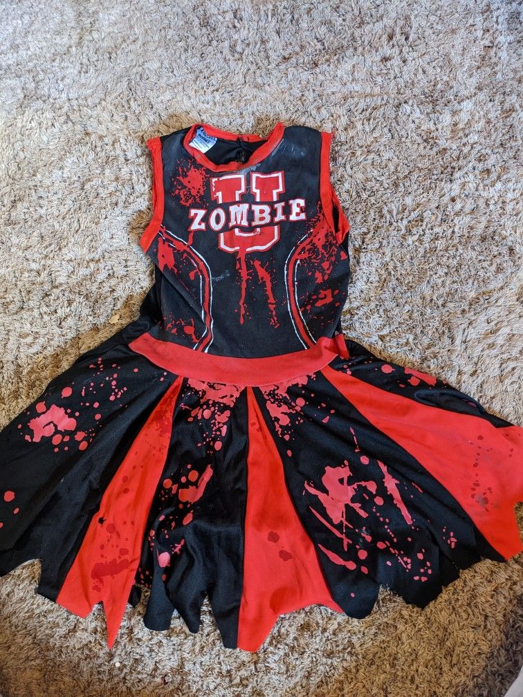 First picture is a zombie cheerleader costume kids size 8 to 10 asking $5 The second picture is a descendants costume kids size large to extra large asking $5 Chucky costume is kids size extra large could definitely fit in adult asking $10 Harley Quinn outfit size 10-12 kids size asking $5 Unicorn outfit asking $5 size 10 only comes with dress you'll have to get unicorn headband. Harry Potter outfit Gryffindor comes with cloak and scarf and uniform asking $10 size medium adults could fit a kid too my daughter wore this. Reptar onesie costume size large adults asking $15