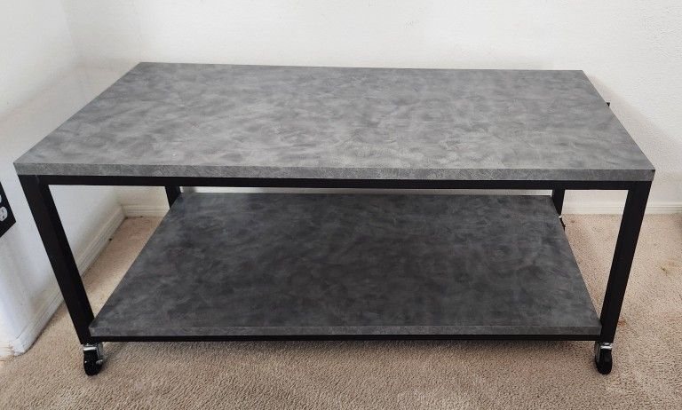 Rolling solid metal and wood storage table on casters / wheels 48 inches wide 24 inches deep 22 inches high. Perfect condition. Two shelves