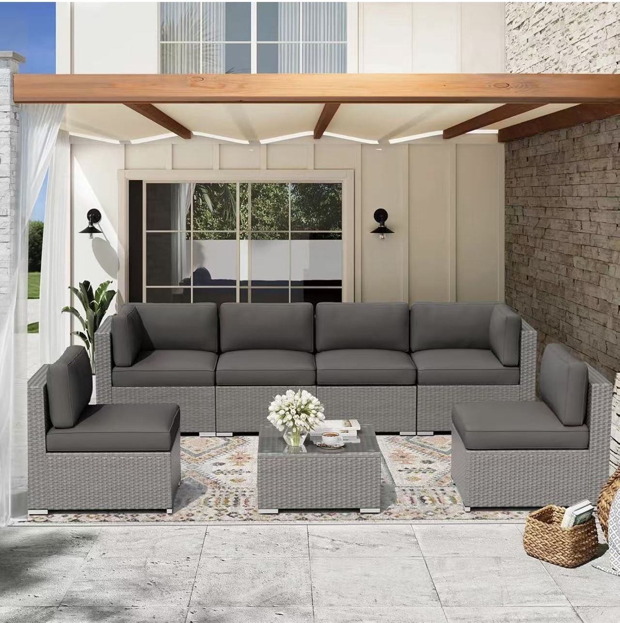Outdoor Patio Furniture Set 7 Piece Outdoor Sectional Sofa Grey Wicker Conversation Sofa Set with Coffee Table and Cushions-Grey