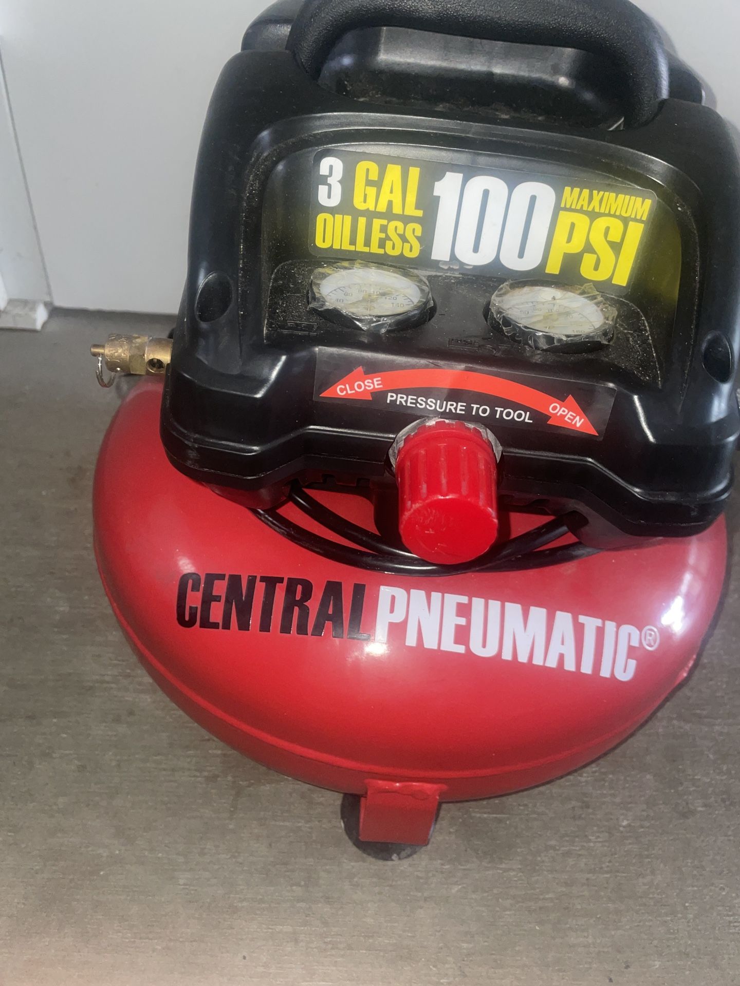 3-gallon, 100-PSI, Oilless Pancake Air Compressor is perfect for inflation, stapling, brad nailing, air brushing Oilless design makes this a low-maintenance air compressor and the “pancake” low-profile construction means you’ll save shop space, and it’ll be easier to move around to where you need it. Compact compressor design, but still delivers the compressed air power you need: 0.6 CFM at 90 PSI, 1.0 CFM at 40 PSI. 3 gallon tank with drain valve Built-in accessory storage Easy-to-read pressure gauge (100 PSI maximum) Thermal overload protection 120 volts, 2.6 amps 6 ft., 18 gauge power cord Air outlet: 1/4" - 18 NPT female brass valve tank drain Shipping Weight: 31.76 lbs.