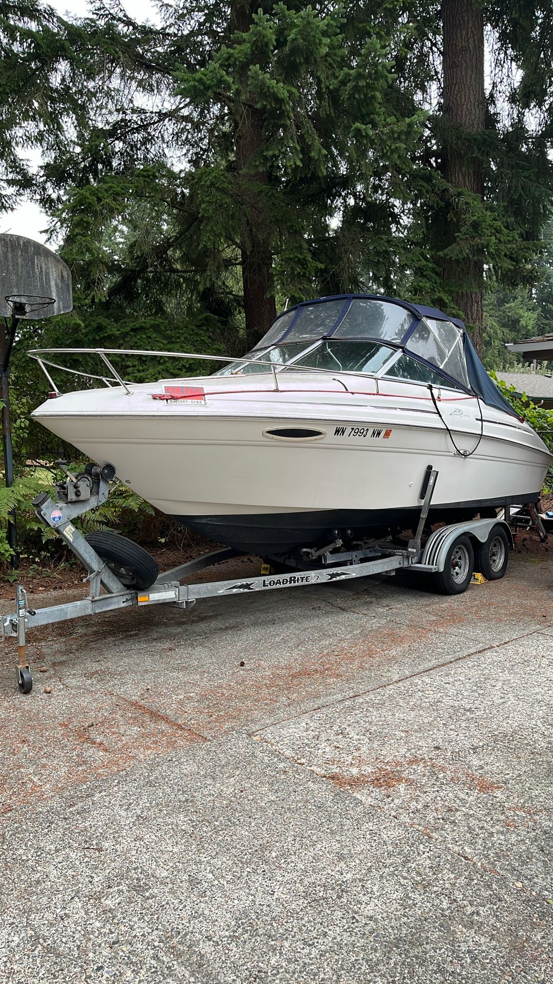 Upgraded 5.7 liter, 265 hp fresh water cooled engine. Overall good shape, comes complete with cover, porta potty, fishing gear and life vests. Ready to sail today, everything is in good working condition, all gages work. Outdrive was replaced last year. Low running hours on the engine. Top speed is around 40 mph. Almost 22 feet of great family fun. Has a full cover Bimini that’s easy on/off installation, and a full tank of gas!