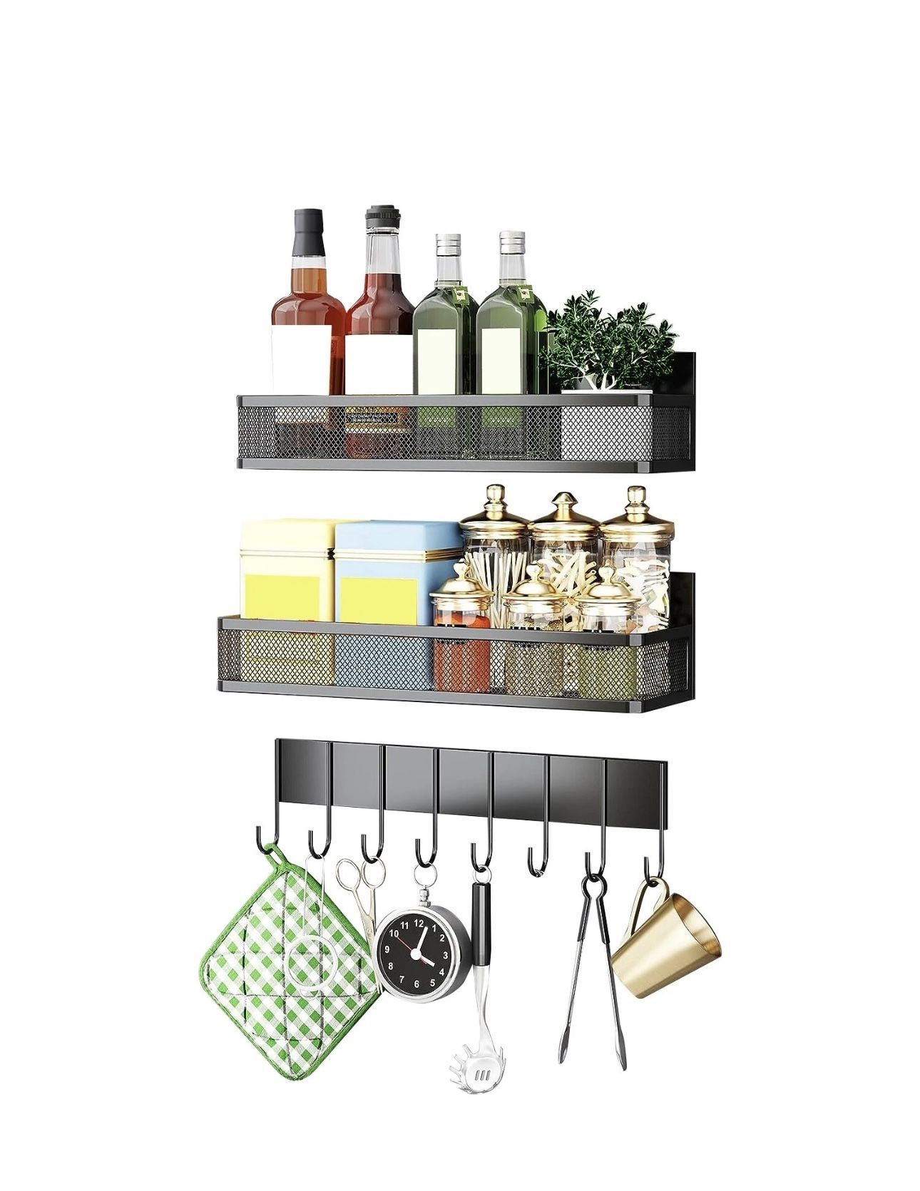 Magnetic Wall-Mounted Storage Shelves with Hooks – Metal Organizer Set Magnetic storage organizer designed for use on metal surfaces such as refrigerators, washing machines, or metal cabinets. Includes: • 2 magnetic metal shelves (mesh design) • 1 magnetic hook rack with multiple hooks Features: • Strong built-in magnets (no drilling required) • Attaches securely to metal surfaces • Durable metal construction • Space-saving design • Mesh shelves for airflow and easy cleaning • Hooks for hanging towels, utensils, tools, etc. • Modern black finish Approximate dimensions (see photos). Condition: • New • Never used Perfect for: • Kitchen (refrigerator organization) • Laundry room (washer/dryer sides) • Garage or utility room