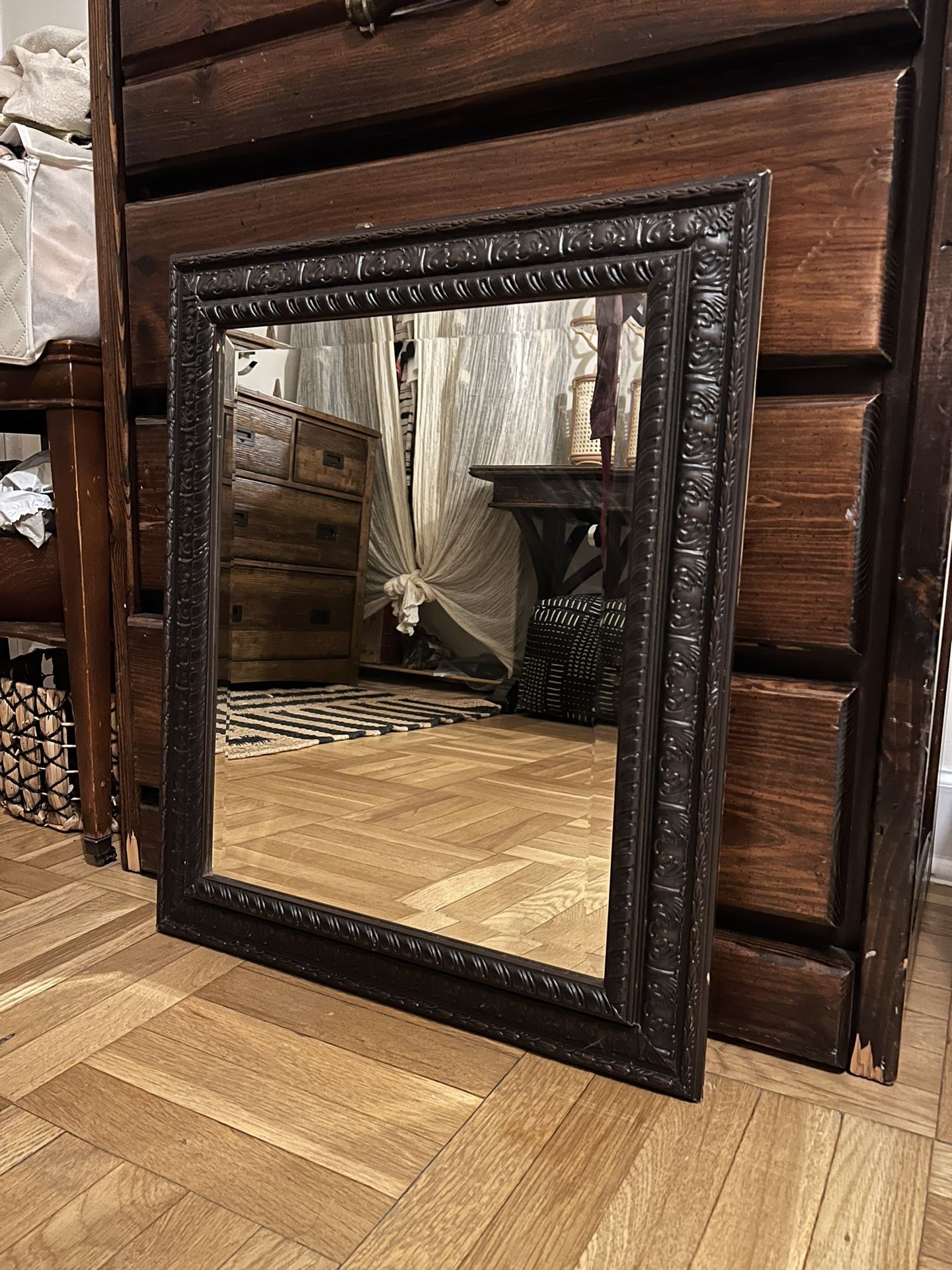 Dark brown rectangular frame with acanthus motif and wonderful texture, immaculate beveled mirror. Good size for hanging in a hallway or bedroom. Silverwood Products. See photos for condition. Approx 22 x 25.5 in