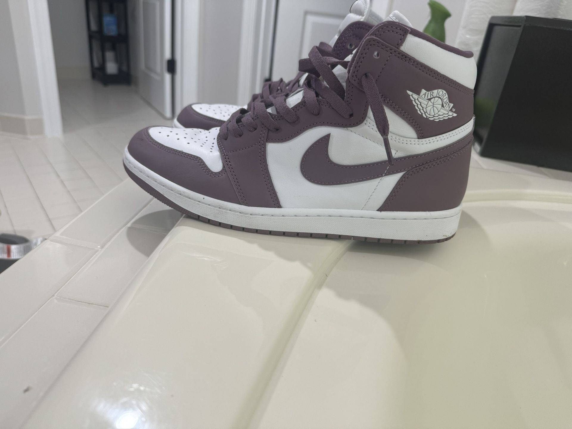 Cash or Zelle/cashapp/venmo accepted pick up only. Maryland wide. The Air Jordan 1 Retro High OG 'Mauve' sports a leather upper in white, highlighted by forefoot and heel overlays in a light violet hue. The pastel color is repeated on the signature Swoosh and woven Nike tongue tag. The high-top is mounted on durable cupsole construction, highlighted by a classic white midsole fitted with encapsulated Air-sole cushioning. A mauve-colored rubber outsole provides grippy traction underfoot