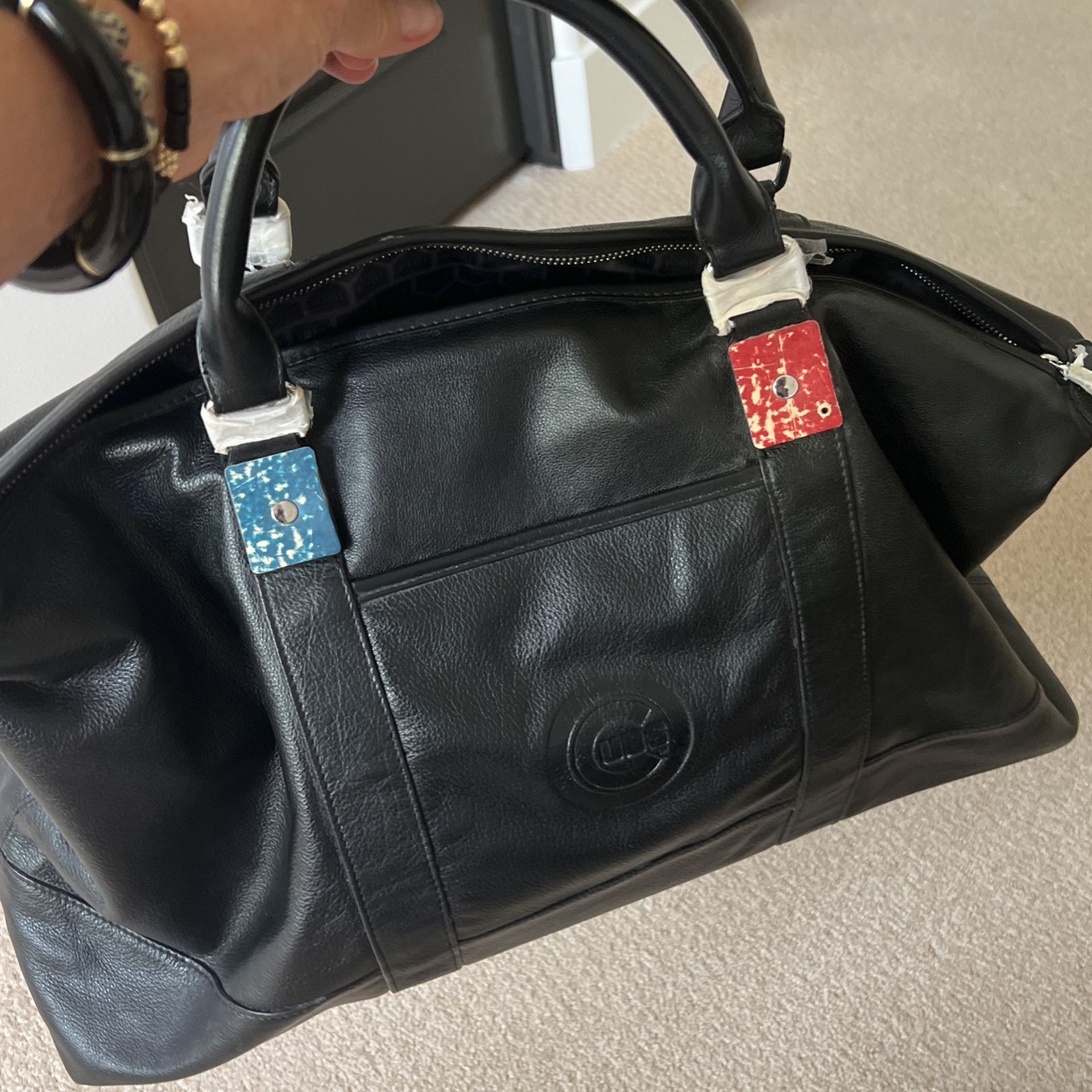 Go to your next trip with this Cubs leather bag. Zips across top and zipped pocket inside. Never been used. PPU