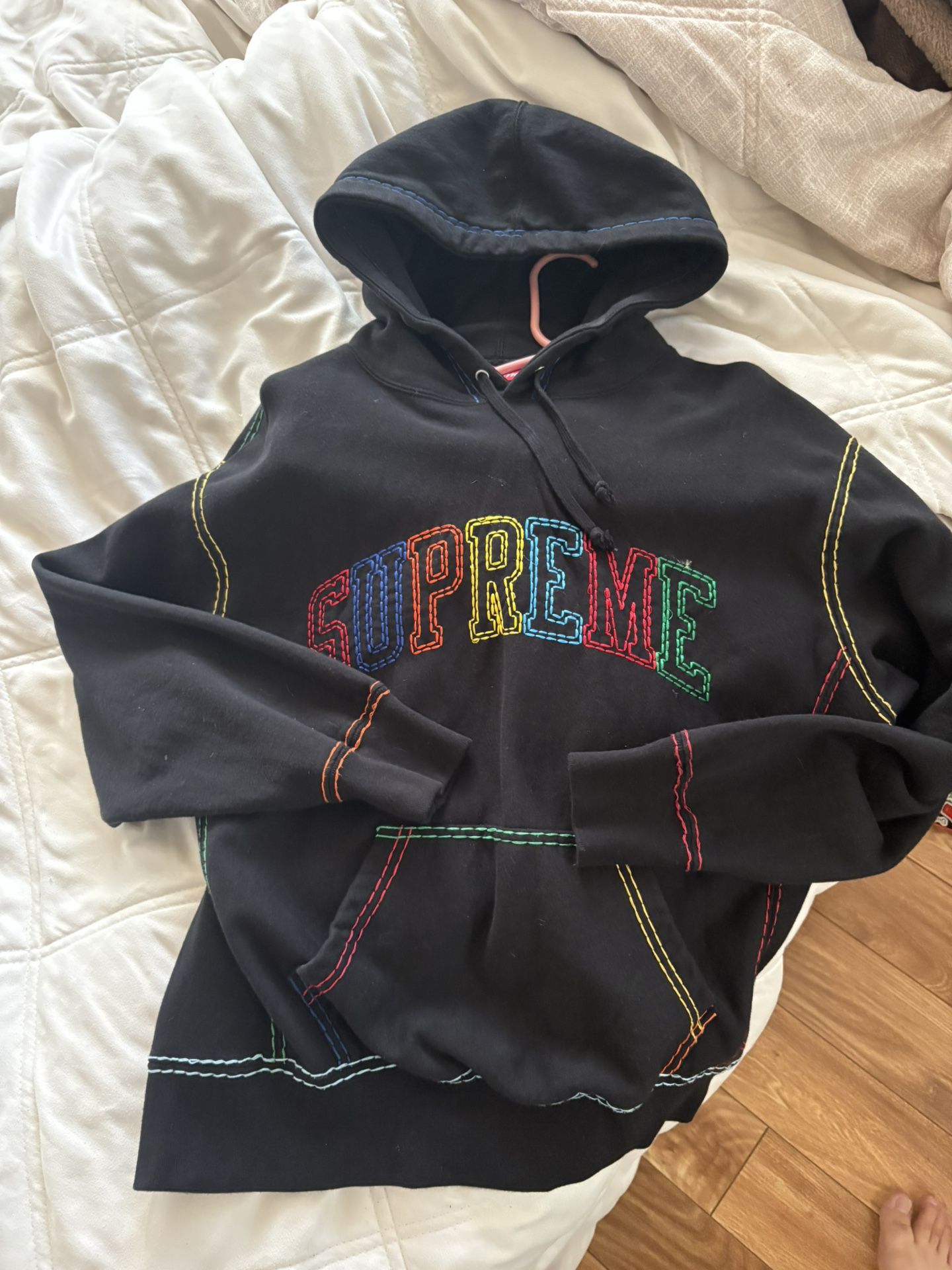 Supreme black hoody colorful oversized stitching. Used new condition. Size medium