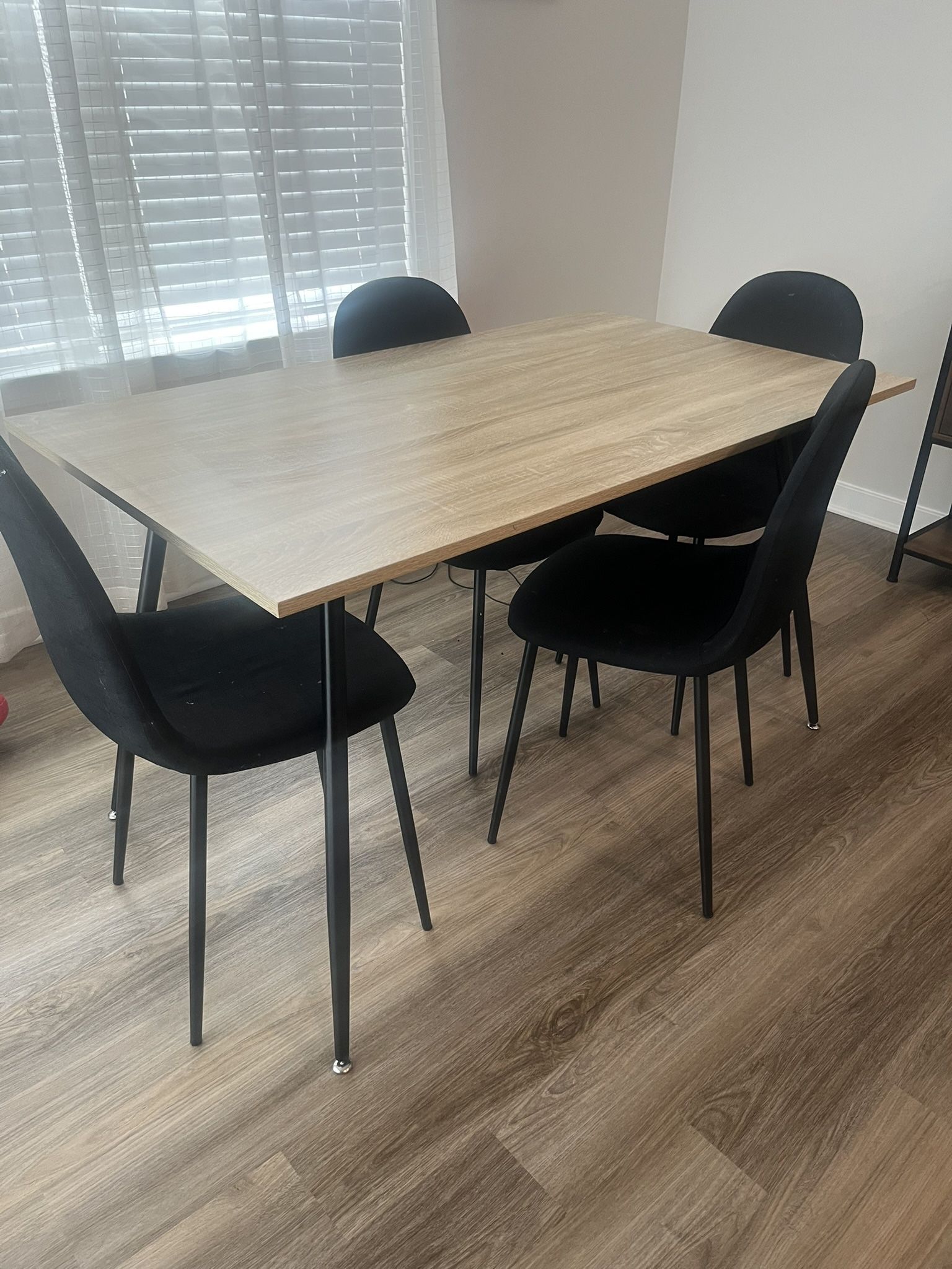 Beautiful modern dining table with a light wood finish and sleek black chairs. Perfect for apartments, condos, or small dining areas. The clean, minimalist design fits well with modern or Scandinavian décor. Seats 4 comfortably Sturdy tabletop with strong metal legs Easy-to-clean, low-maintenance surface Multi-use: dining, work-from-home, or study table Neutral colors that match any interior Excellent condition – no damage This set offers a high-end look at a great price compared to buying new.