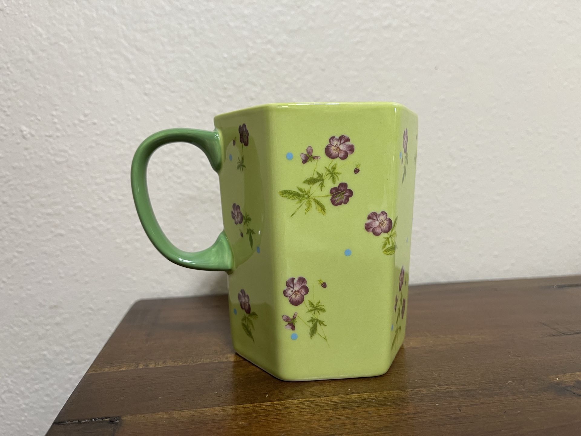 New with tags, lime green hexagon shaped Anthropolgie mug with little purple flowers. Has a green handle and ‘I Love You’ saying inside lip.