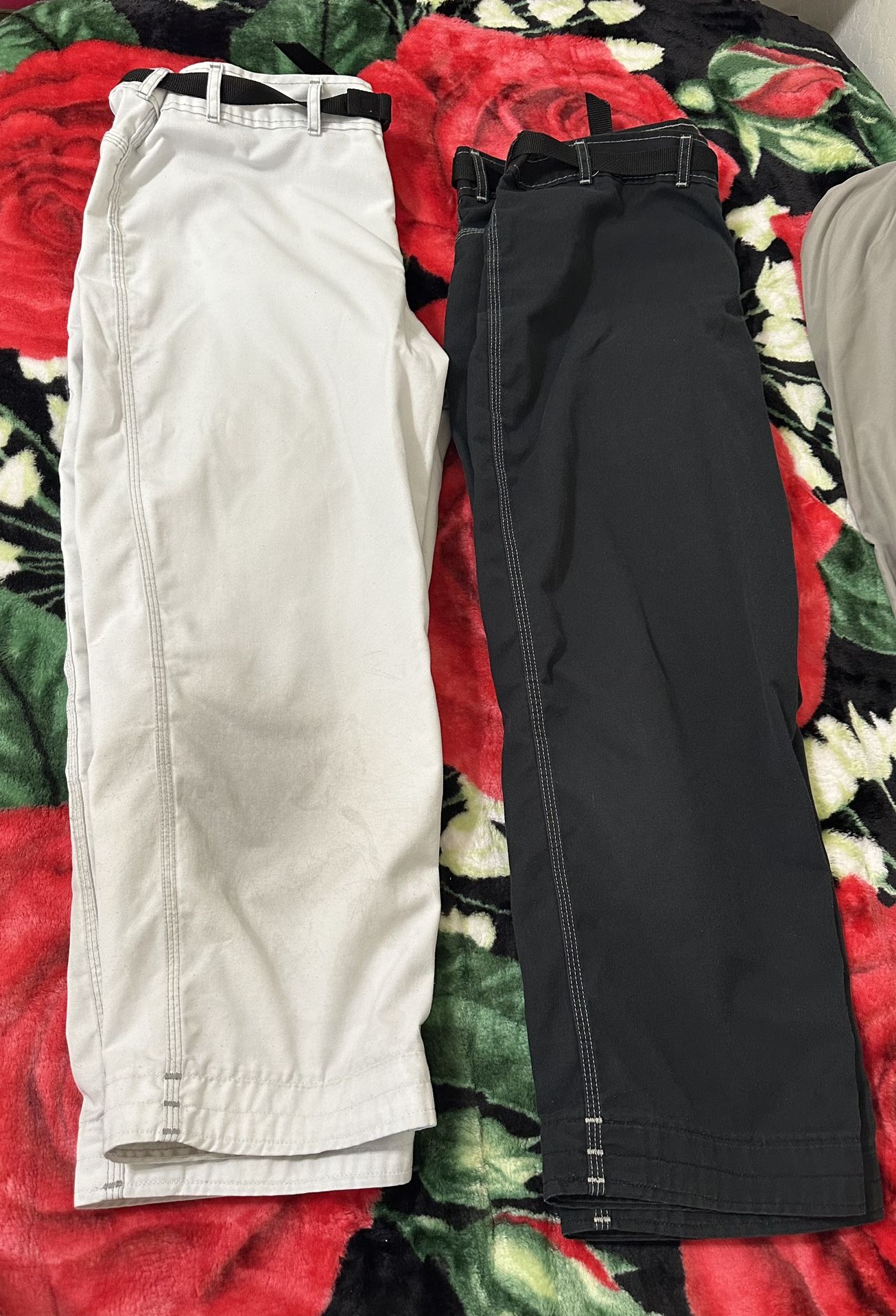 This is two origin pants. They are both slightly used and the size is 38X30. They used to fit amazing but, I just lost tons of weight and they are taking space in my closet. I am keeping the tops but if wanted can part ways with one white A3 top. Asking 50 for both will not separate pants.
