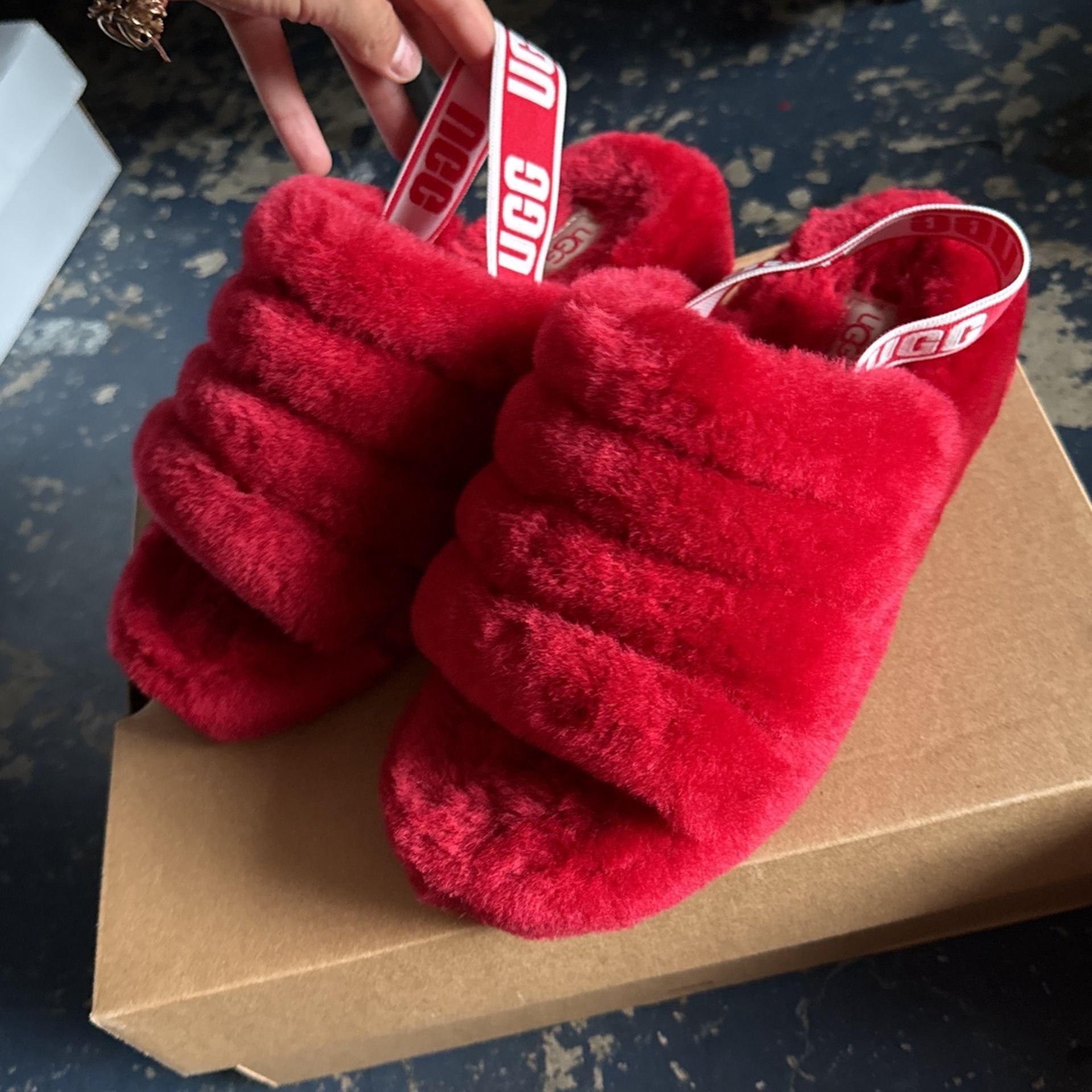UGG fluff slide- ribbon red