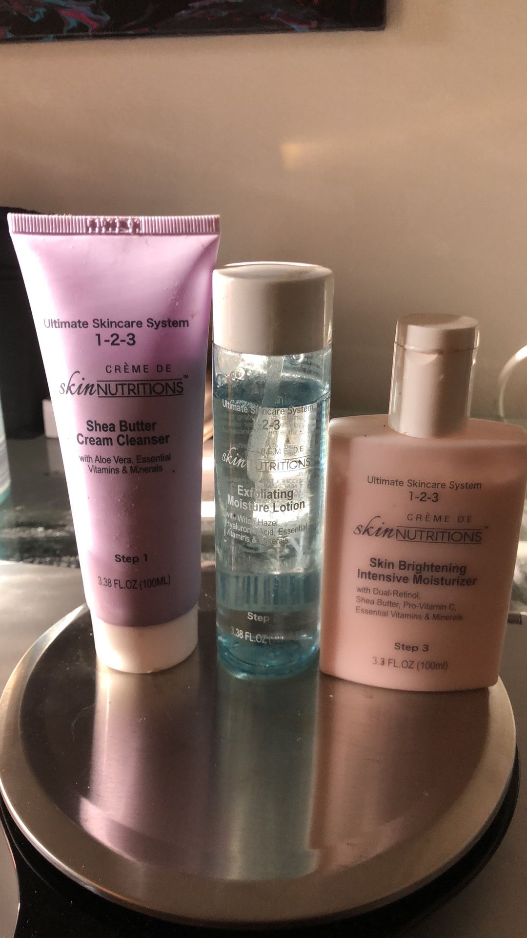 Ultimate Skincare Routine System Steps 1-3 only tried once and wasn’t for my skin type. Outside of bottles got dirty inside is fine though. Step 1: Shea Butter Cream Cleanser. Aloe Vera, Essential Vitamins & Minerals Step 2: Exfoliating Moisture Lotion. Witch Hazel, Hyaluronic Acid, Essential Vitamins, & Minerals Step 3: Skin Brightening Intensive Moisturizer. Dual-Retinol, Shea Butter, Pro- Vitamin C, Essential Vitamins & Minerals