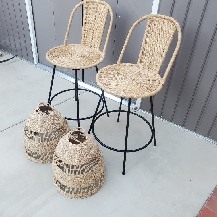 Wicker bar stools with pendent light shades.