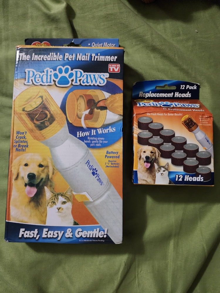 This item we bought for our dog but she was scared of it. Box is not perfect, the item we never got a chance to use it. Comes with four pads inside the box and a new pack of 12 heads. Petty claws Petty Paul's Pedi paw Nail trimmers filer Electric, battery Sandpaper