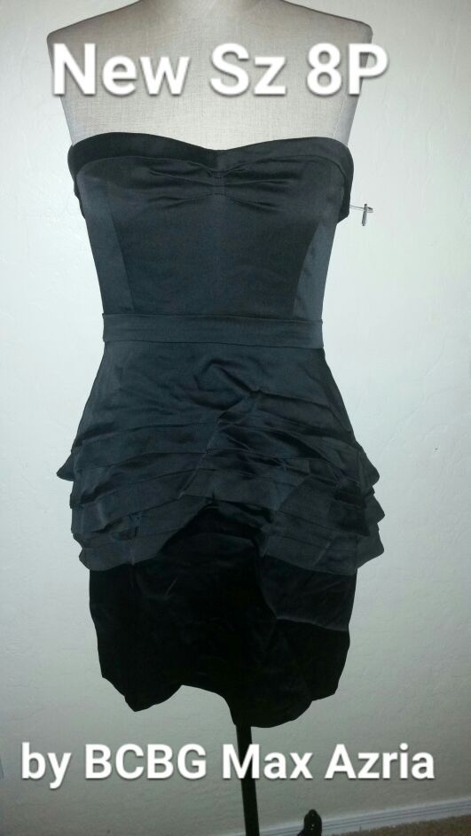 This dress is new and is a women's size 8 petite. It is made by designer bcbg max azria. This has a hidden back zipper and unique ruffles at the waist. This is a strapless dress with a ruched Center neckline. The dress does need to be pressed but it's in perfect condition. Great for a cocktail party or girls night out!! #OU22