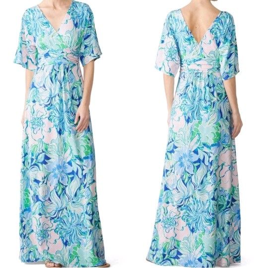 prices firm. Brand new with tag. Never worn. Lily Pulitzer size large. This beautiful Lilly Pulitzer Parigi Maxi dress is perfect for any occasion. The Party Thyme Floral pattern is eye-catching and the kimono sleeves add a touch of elegance. The V-neckline and pullover closure make it easy to wear, while the stretch material ensures a comfortable fit. The dress is made of high-quality spandex and rayon, with a jersey fabric type that is easy to care for. It is a long dress that is suitable for travel, weddings, parties, and casual events. The dress is multicolor and features a flower theme, making it a great addition to any wardrobe. Colorful floral pattern, short sleeves.