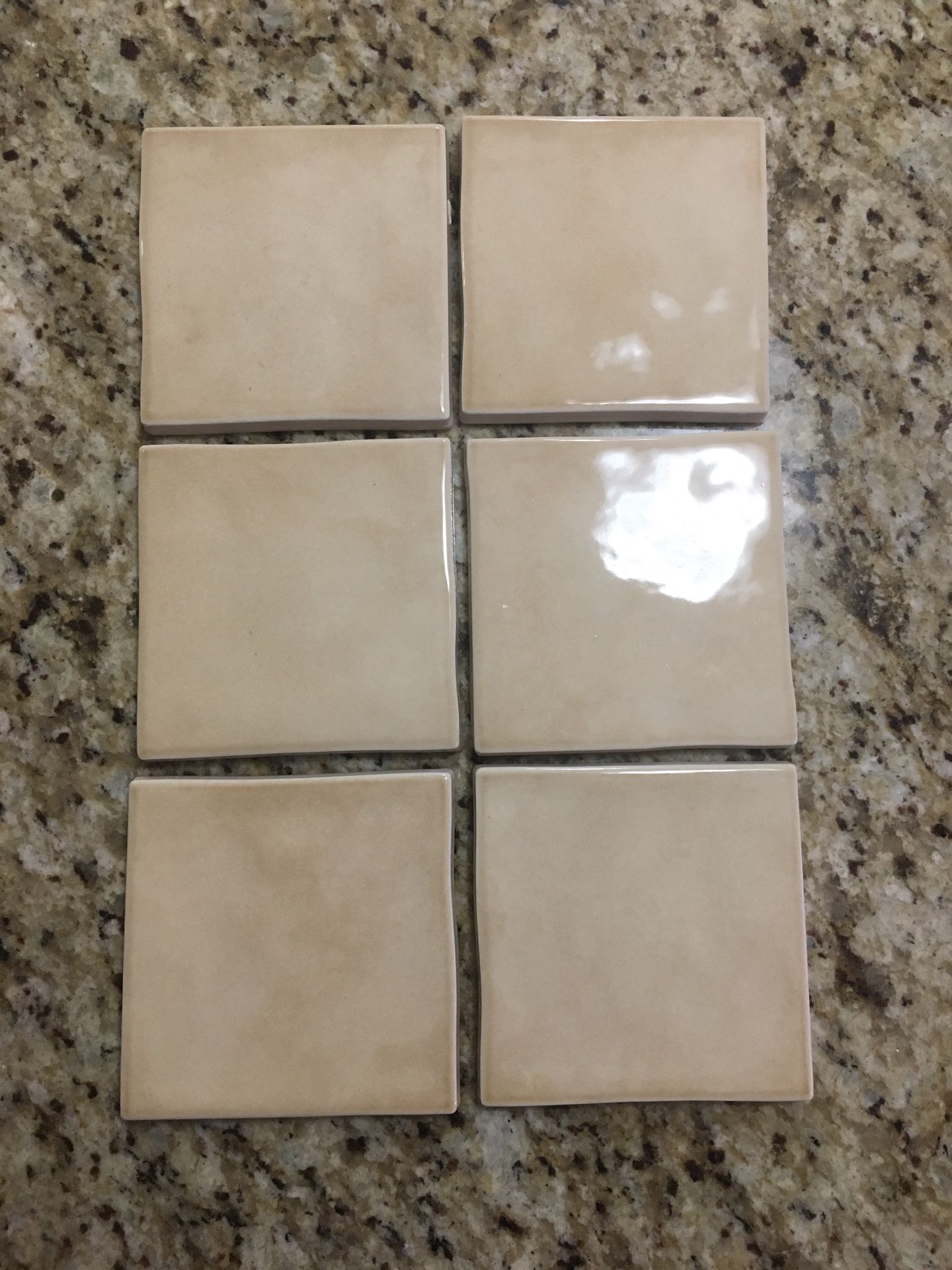 Made in Italy 4x4 wall tile. There are 76 regular tiles plus 4 bullnose tiles(3 bullnose one sided and 1 bullnose 2 sides). Selling all as a set only. The handmade wall tile adds a charming, artisanal-style design element to your space. The 4" x 4" gloss-finish tile features a blend of beige/taupe tones and with uneven edges and surface texture. Each tile stamped Made In Italy.