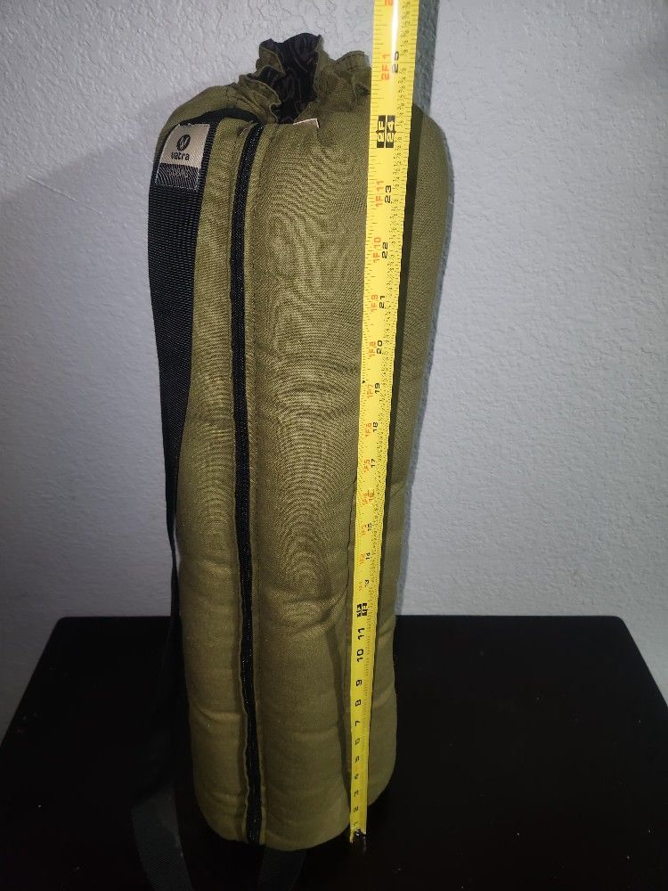 24 inches tall. I used it for my 21 inch tall tripple perc glass "vase". Super fluffy but sturdy. Green hemp like outer and smooth inside with one pocket for bowls and downstems. Drawstring open style top with over the shoulder strap. Message for any questions! Thanks