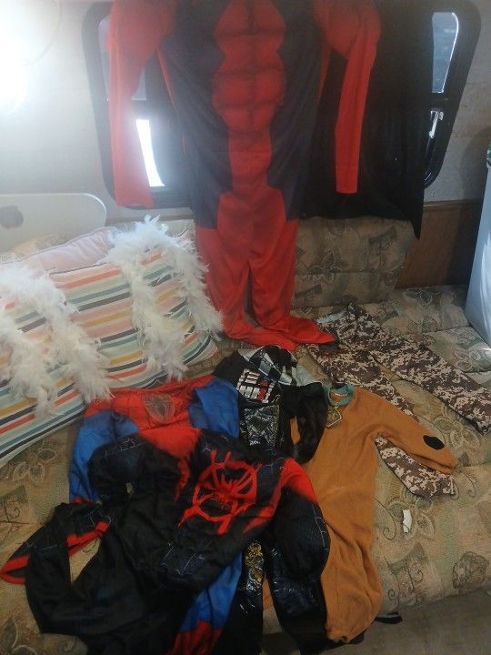 10 for Adult Deadpool Costume. 10 for Spiderman small 3/4. 10 for Starwars 7/8. 8 for Scooby Doo. 3 for Army pants. 3 for white Feathers.