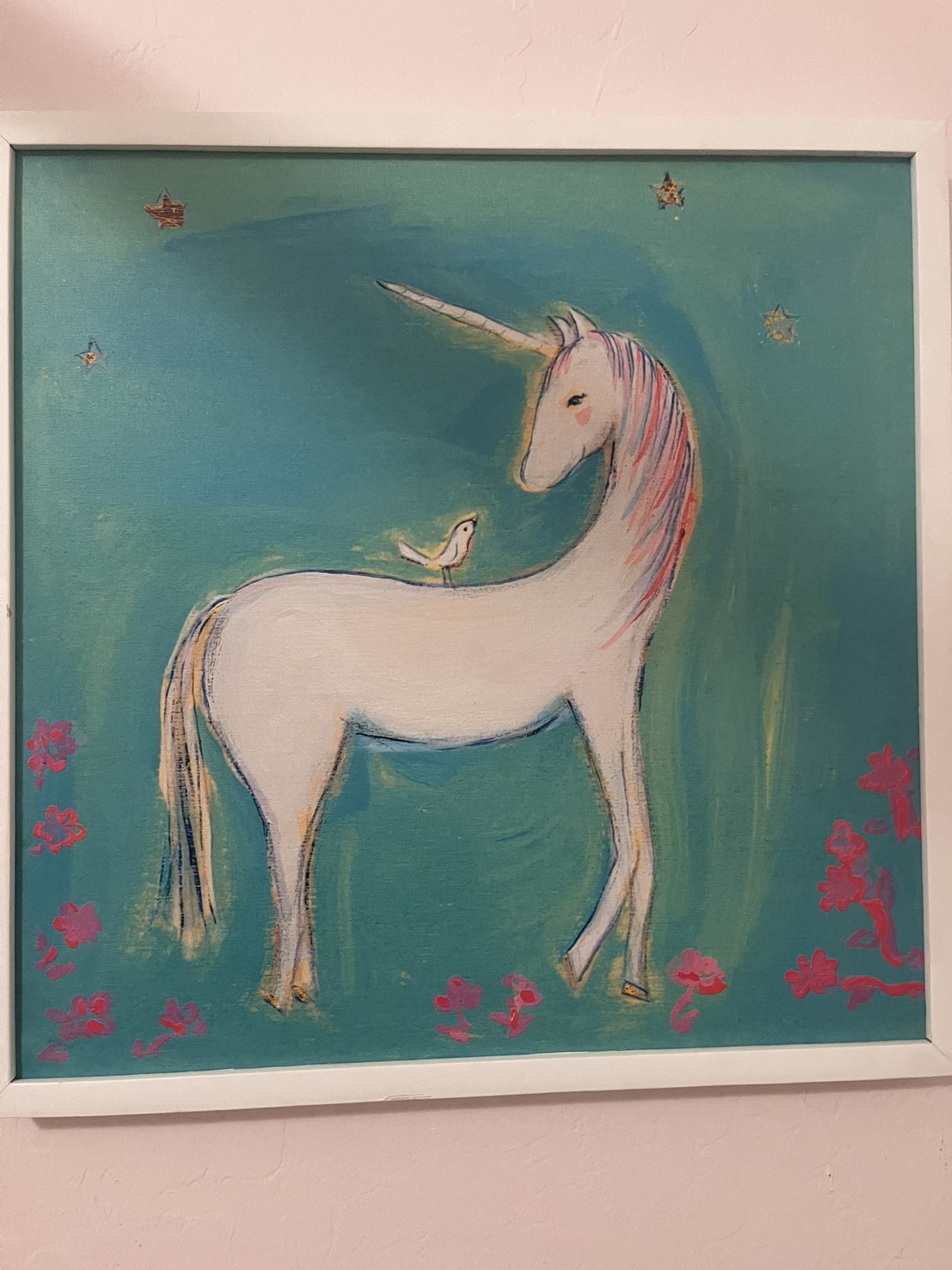 Kids unicorn canvas painting in a white wood frame. Oopsy daisy art from pottery barn kids. $25 19x19 Pick up in chandler (McQueen/ocotillo) Girls bedroom Wall decor
